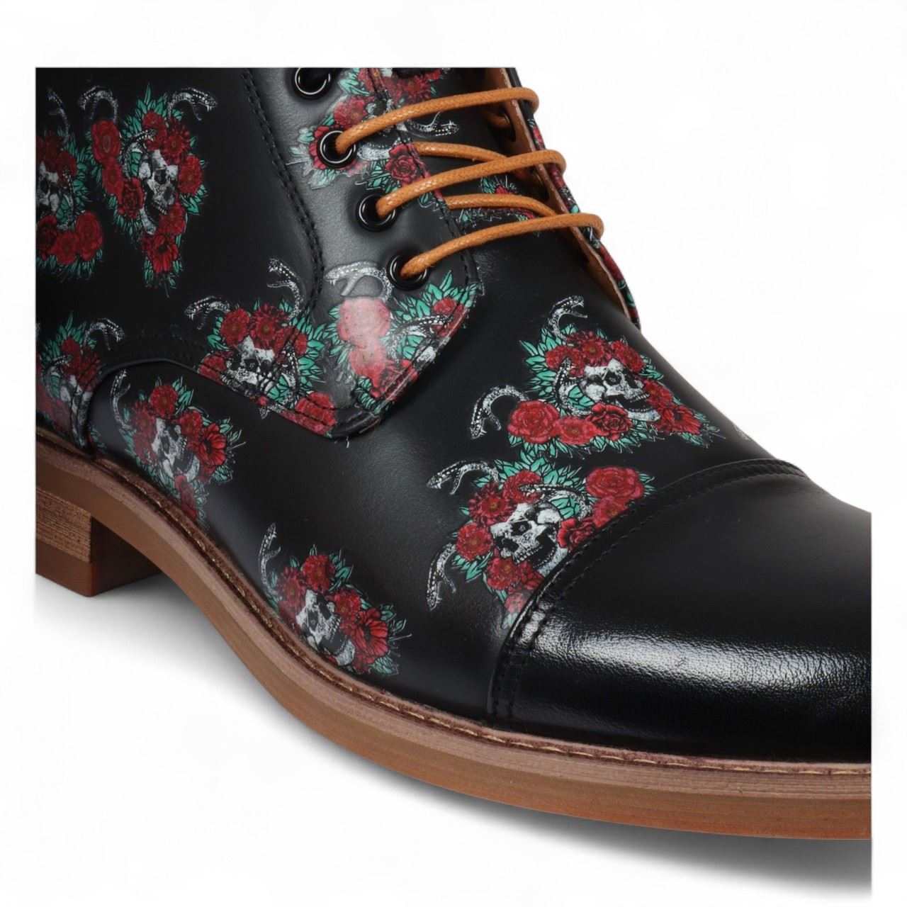 Justin Reess Men's Black Floral Skull Print Leather Oxford Ankle Boots - Adam Skull