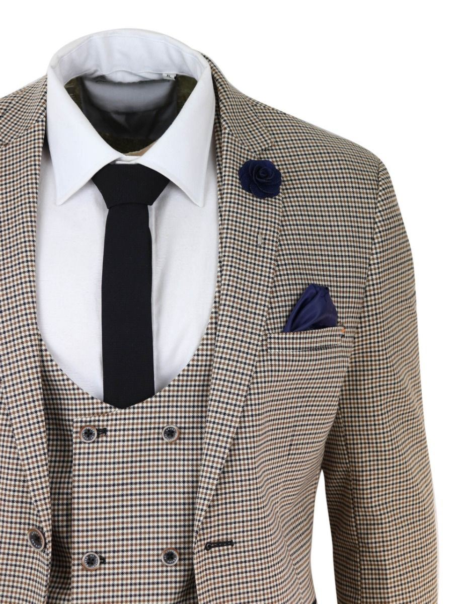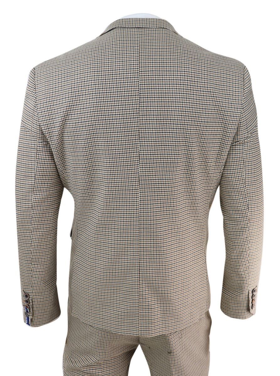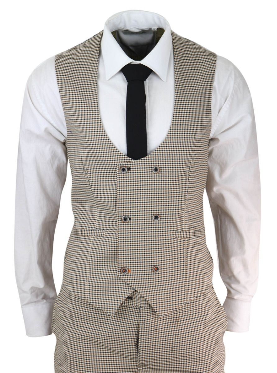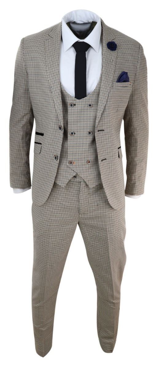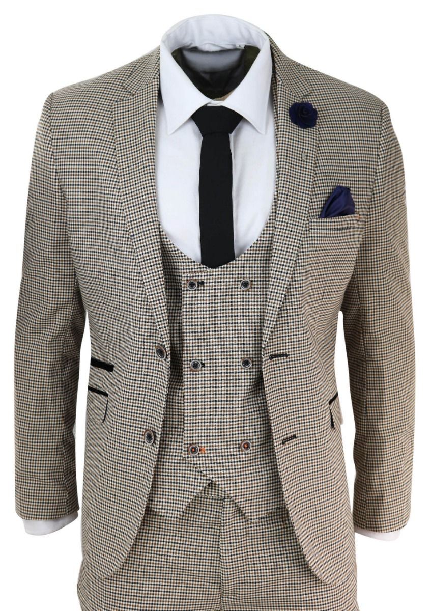 Mens 3 Piece Beige Check Retro Vintage Classic Suit