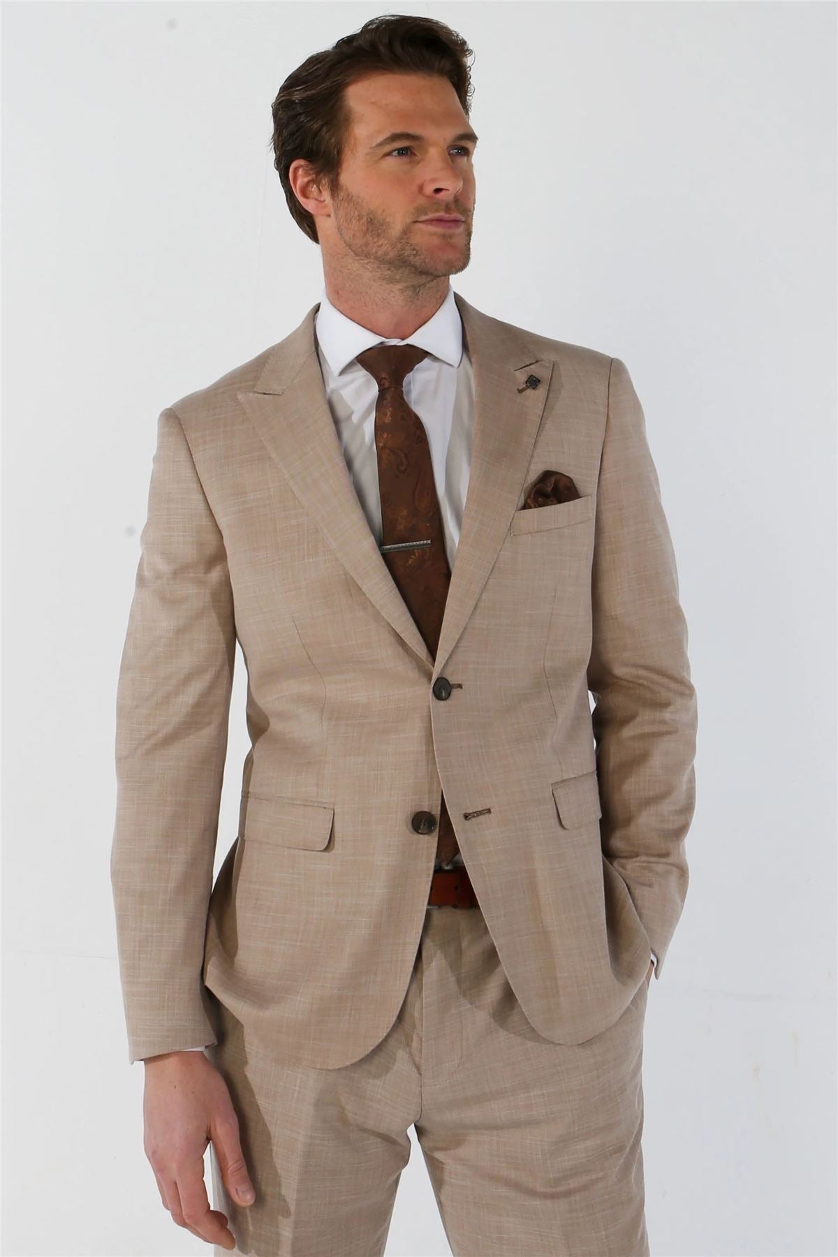 Step into summer in style with this elegant beige 3-piece suit, perfect for weddings, garden parties, or any formal occasion. Designed with a tailored fit, this ensemble offers a sharp and modern silhouette that flatters the body while providing all-day comfort. The high-quality blend of polyester and viscose ensures a soft, breathable feel with excellent durability. This versatile set includes a matching jacket, waistcoat, and trousers, giving you the flexibility to mix and match or wear as a complete look. Whether you're the groom, a guest, or attending a special event, this suit delivers timeless sophistication with a warm-weather twist.
