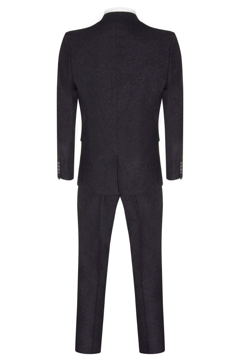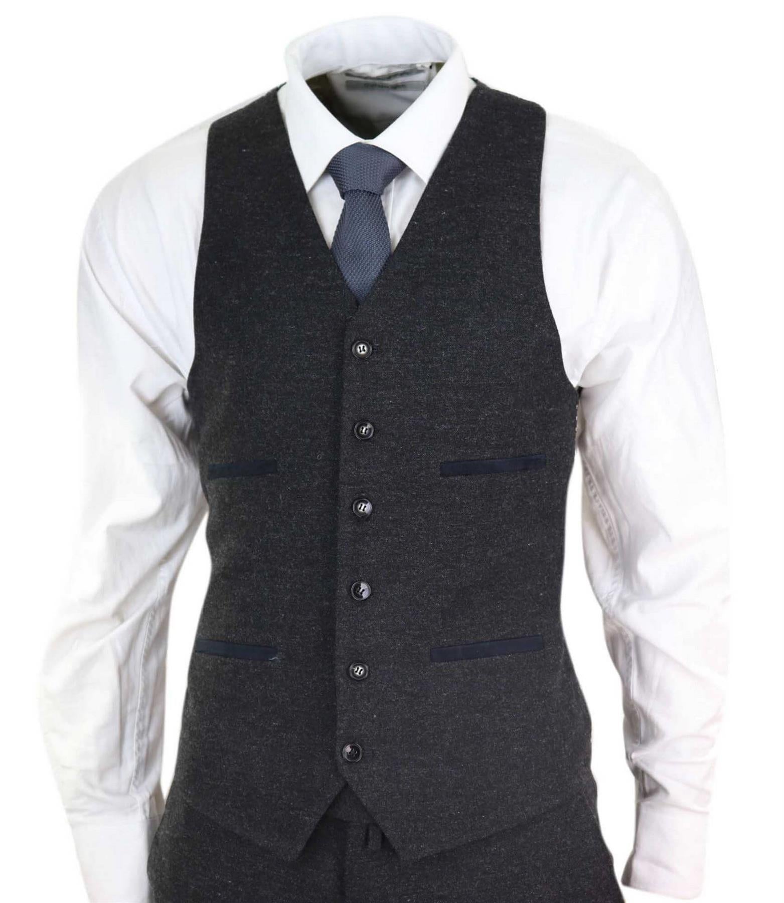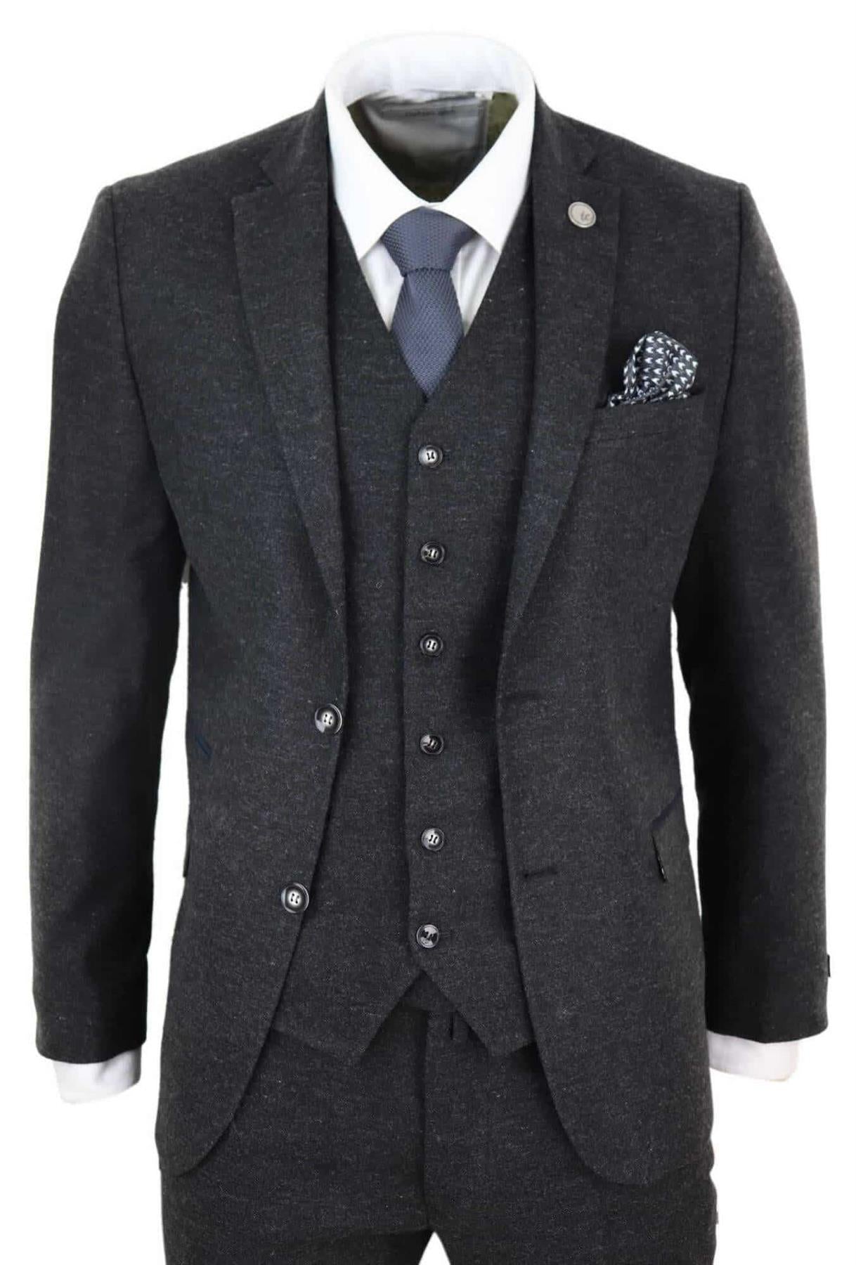 Mens 3 Piece Black Wool Tweed Vintage Retro Suit A black suit is a key staple in every mans wardrobe and this one is no exception to this unwritten rule. Sharp, sleek and sophisticated, look the part with this premium 3 piece black wool tweed suit, that features a slim fit cut, with a closer fit across the chest and narrower tailored trousers. the two-button jacket hangs beautifully and has a half canvas construction that moulds to your body shape the more you wear it.