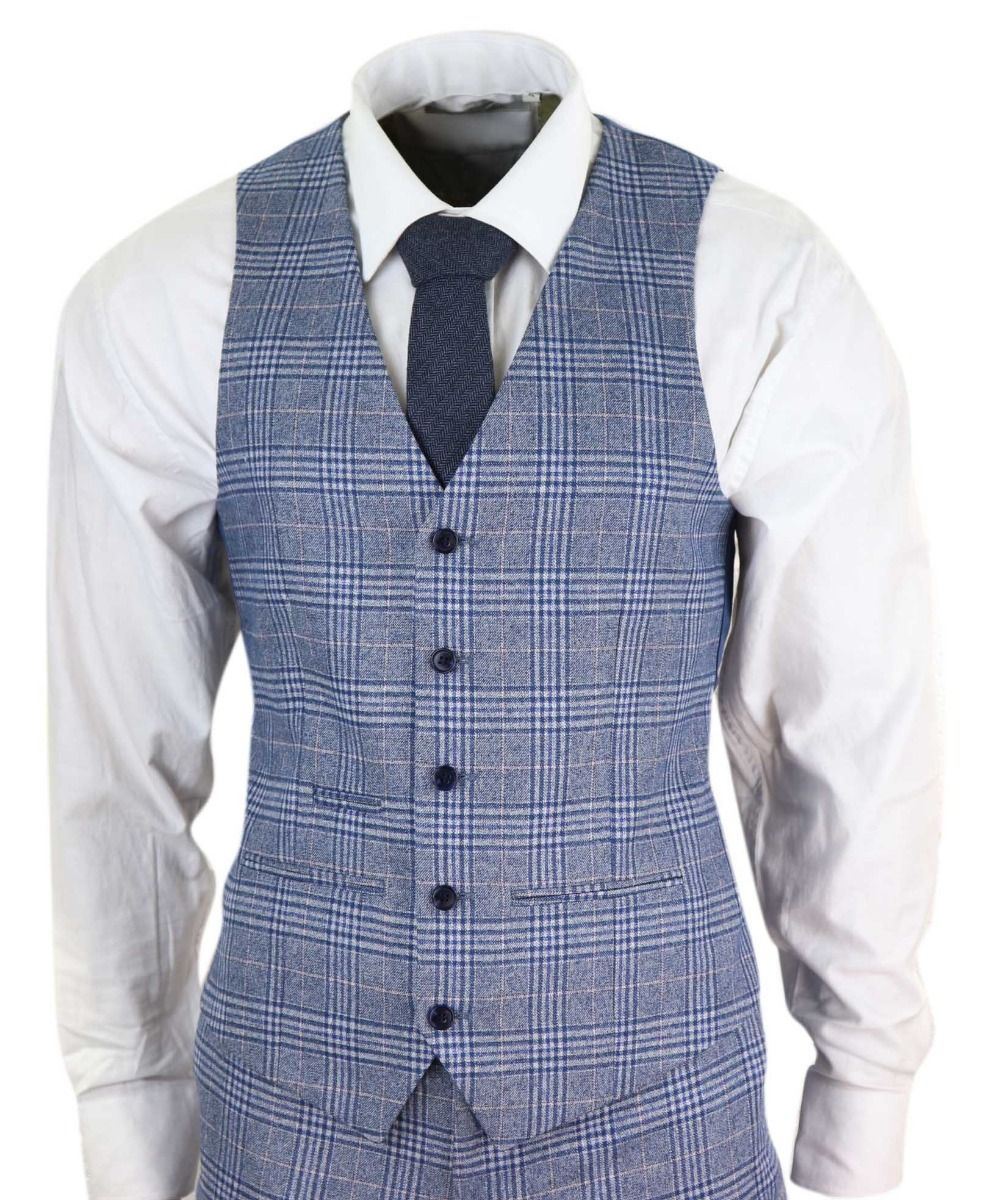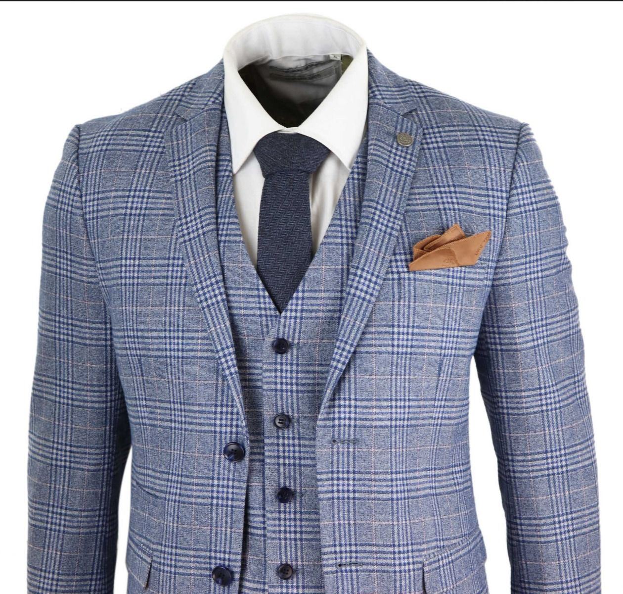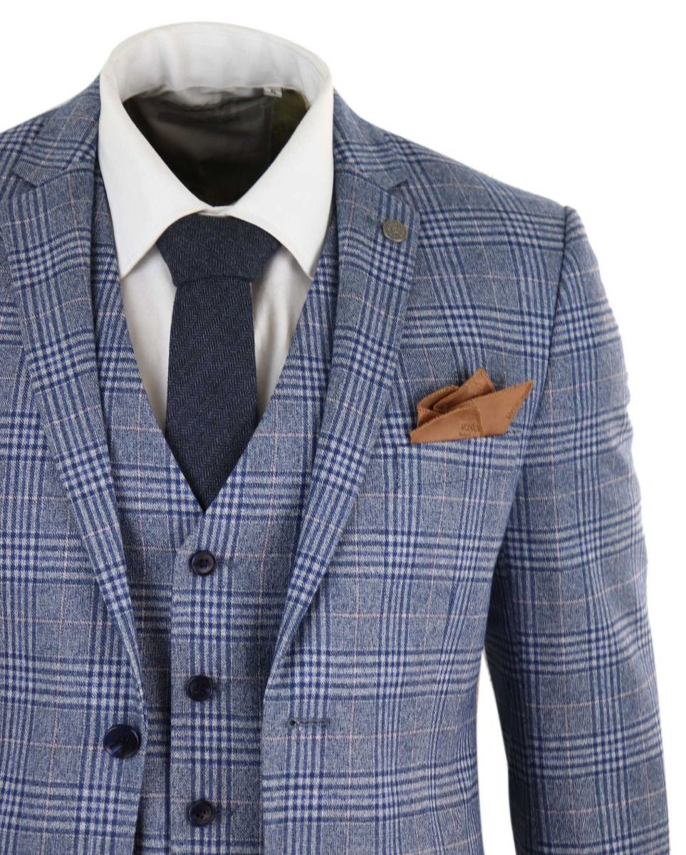 Mens 3 Piece Blue Grey Tweed Check Vintage Retro Suit