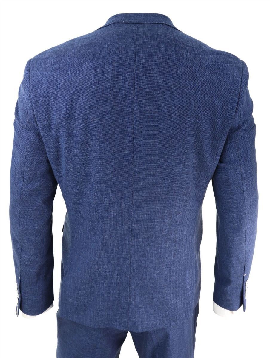 A Blue suit is a key staple in every mans wardrobe and this one is no exception to this unwritten rule. Sharp, sleek and sophisticated, look the part with this premium 3 piece blue linen suit, that features a tailored fit cut, with a closer fit across the chest and narrower tailored trousers. the two-button jacket hangs beautifully and has a half canvas construction that moulds to your body shape the more you wear it.