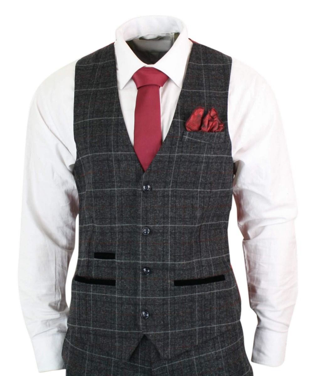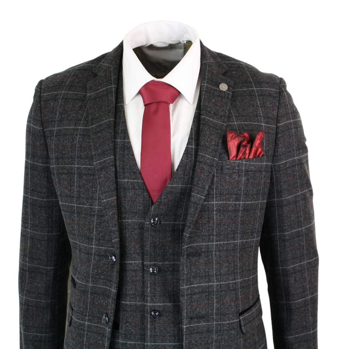 Mens 3 Piece Charcoal Grey Tweed Check Vintage Retro Suit