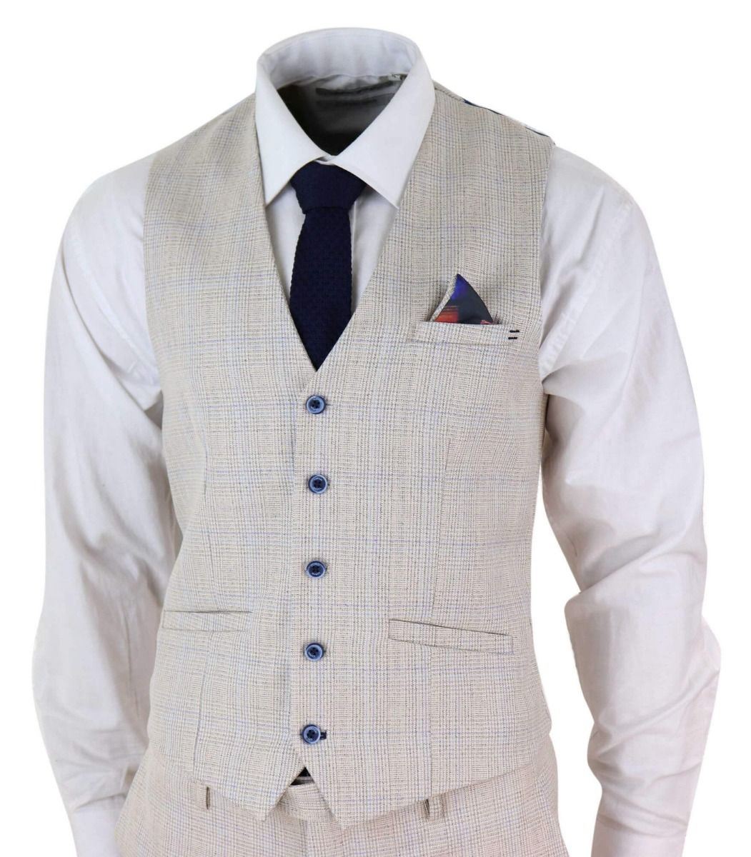 Mens 3 Piece Cream Check Tweed Herringbone Vintage Classic Suit