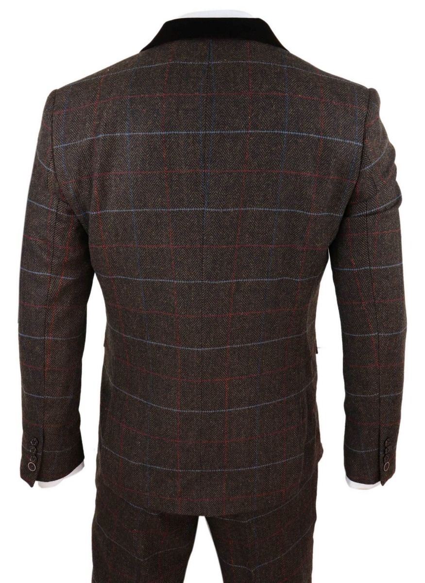 Mens 3 Piece Dark Brown Check Tweed Herringbone Vintage Classic Suit