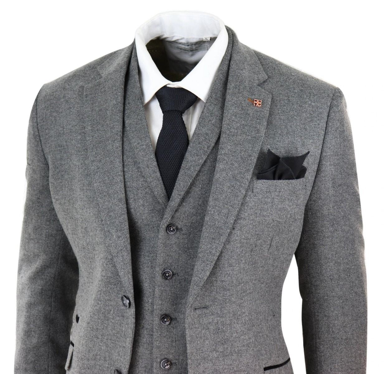 A suit is a key staple in every mans wardrobe and this one is no exception to this unwritten rule. Sharp,sleek and sophisticated, look the part with this premium 3 piece grey wool herringbone tweed suit,that features a slim fit cut,with a closer fit across the chest and narrower tailored trousers.the two-button jacket hangs beautifully and has a half canvas construction that moulds to your body shape the more you wear it.