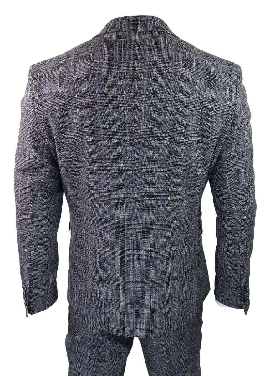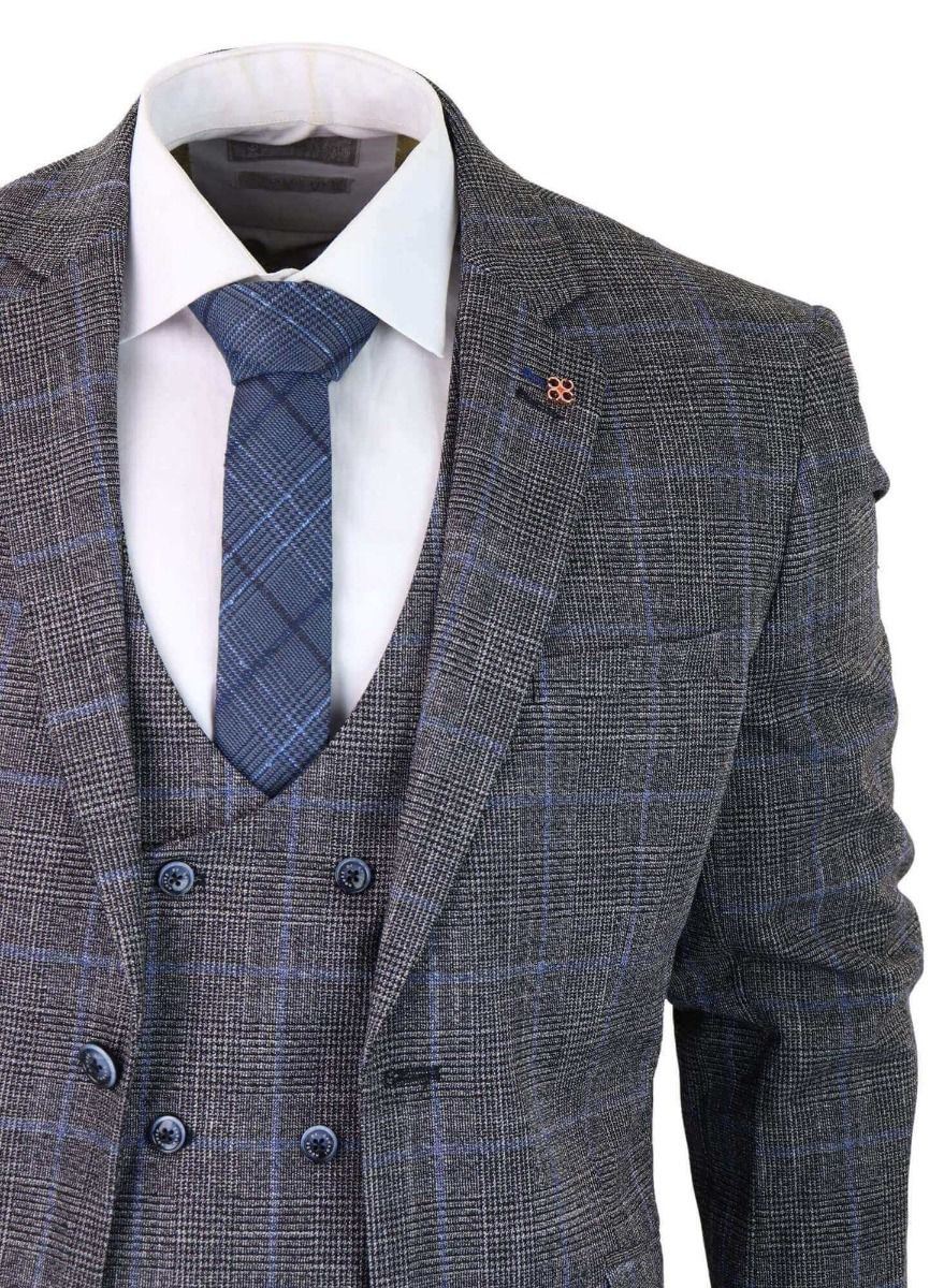 Mens 3 Piece Grey With Blue Check Tweed Vintage Classic Suit