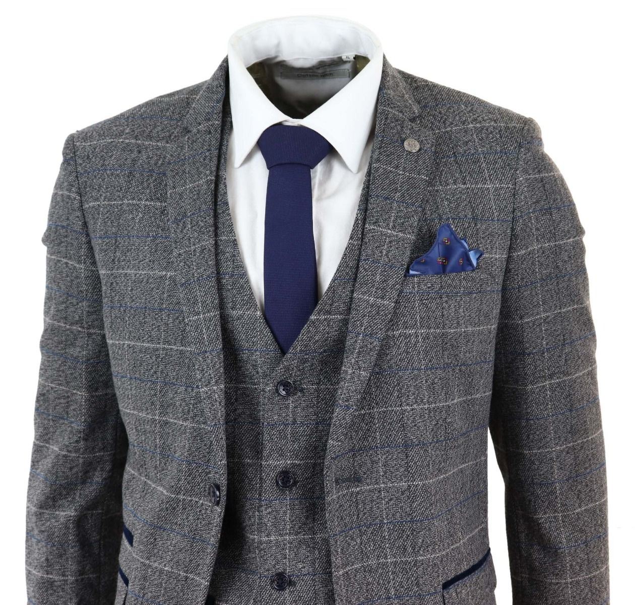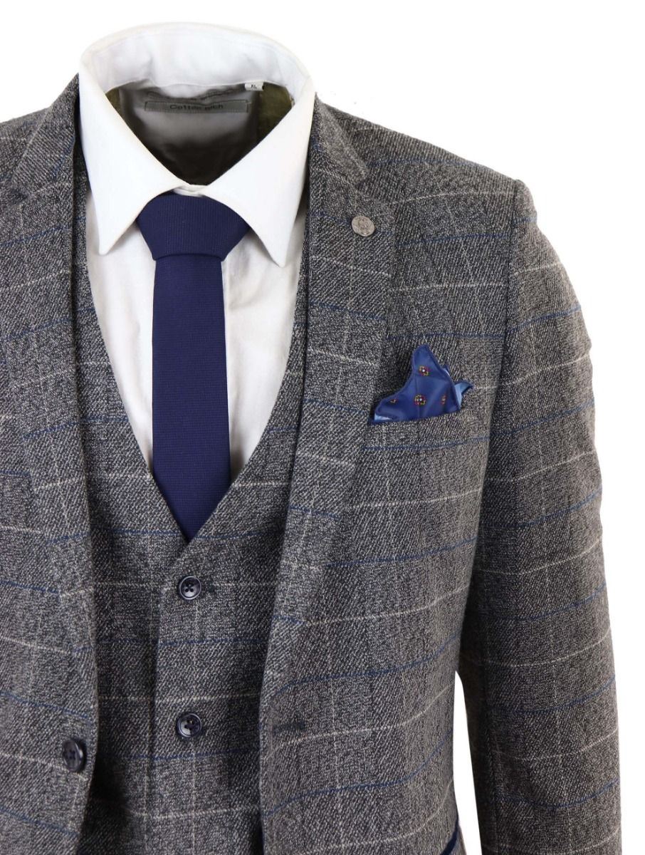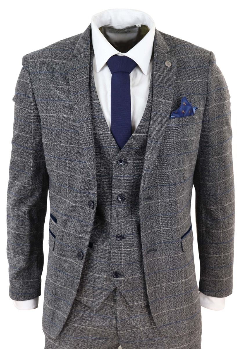 Mens 3 Piece Grey With Blue Check Vintage Classic Suit