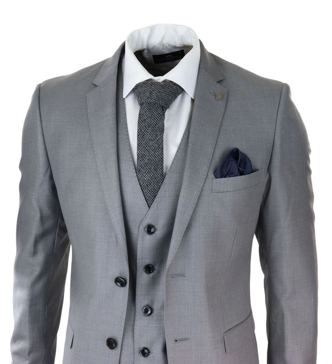 Mens 3 Piece Light Grey Classic Stitch Retro Suit