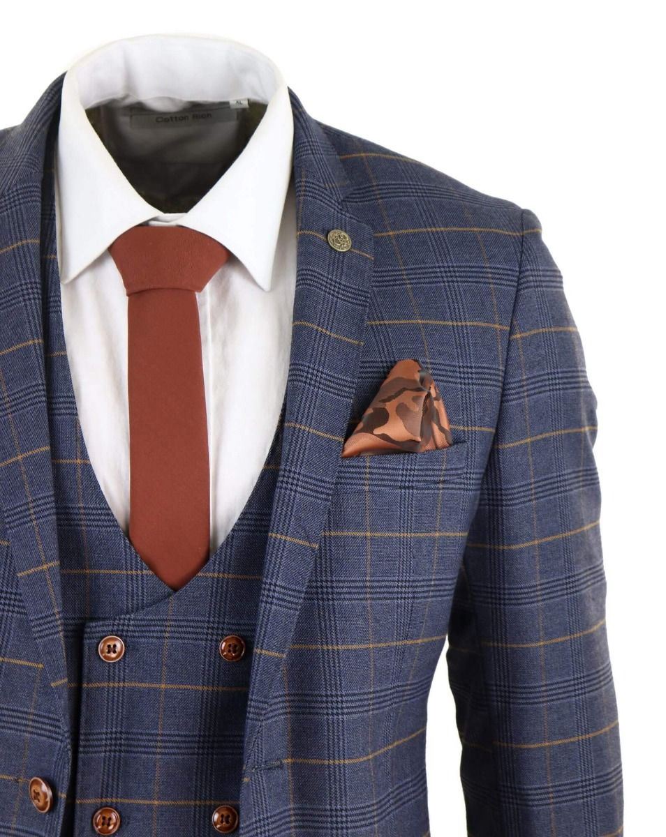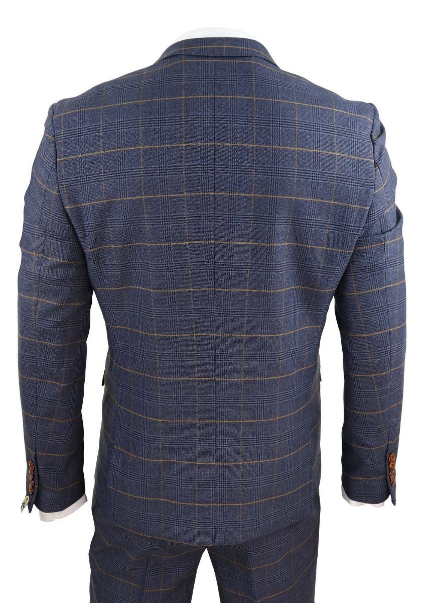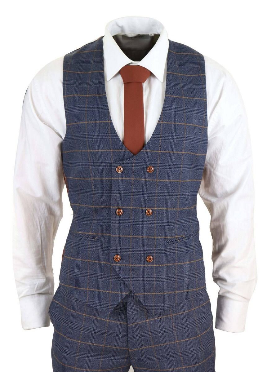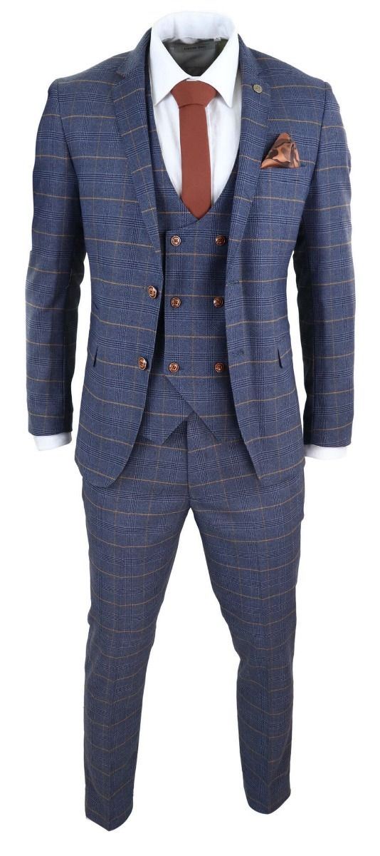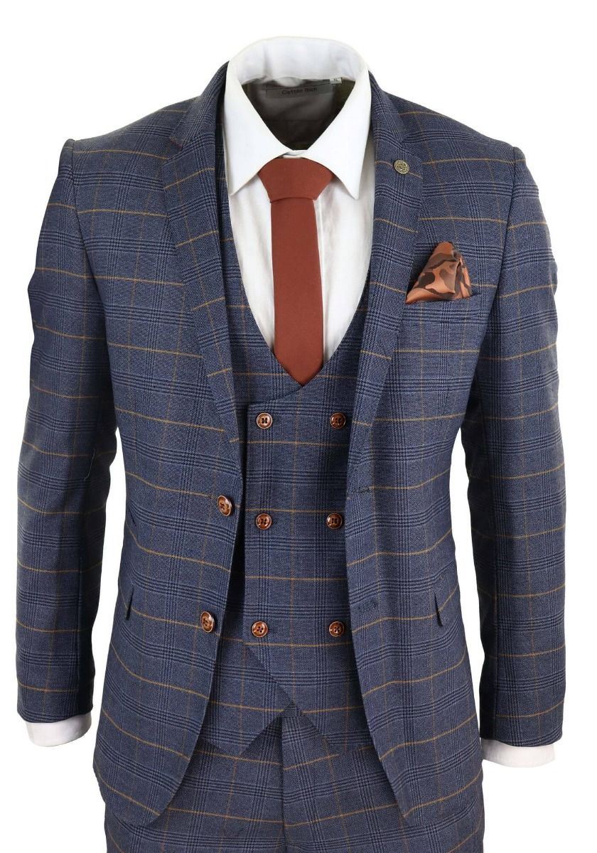 Mens 3 Piece Navy Blue Retro Check Vintage Classic Suit