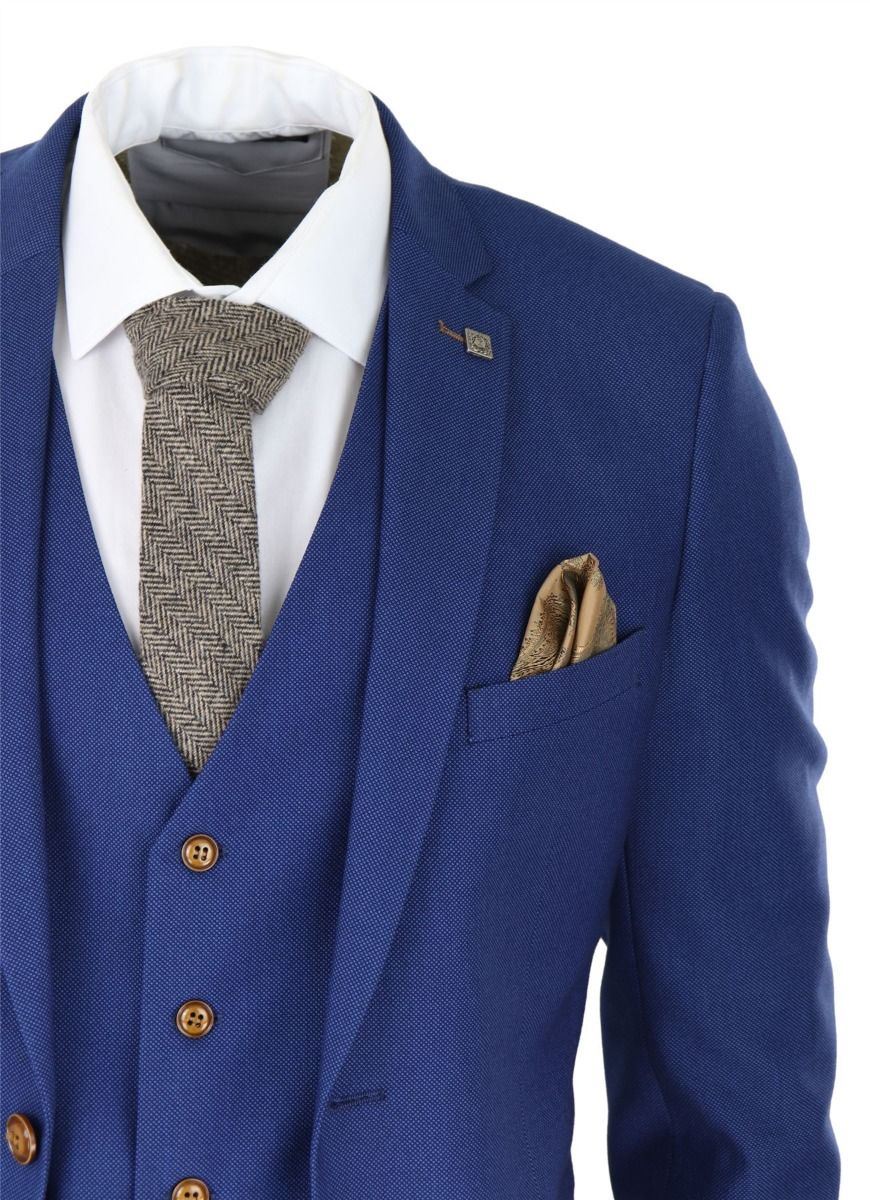 A blue suit is a key staple in every mans wardrobe and this one is no exception to this unwritten rule. Sharp, sleek and sophisticated, look the part with this premium 3 piece royal blue birdseye tweed suit, that features a slim fit cut, with a closer fit across the chest and narrower tailored trousers. the two-button jacket hangs beautifully and has a half canvas construction that moulds to your body shape the more you wear it. Contrasting brown buttons, buttoned cuffs and a double back vent lend the suit a classic touch of refinement.