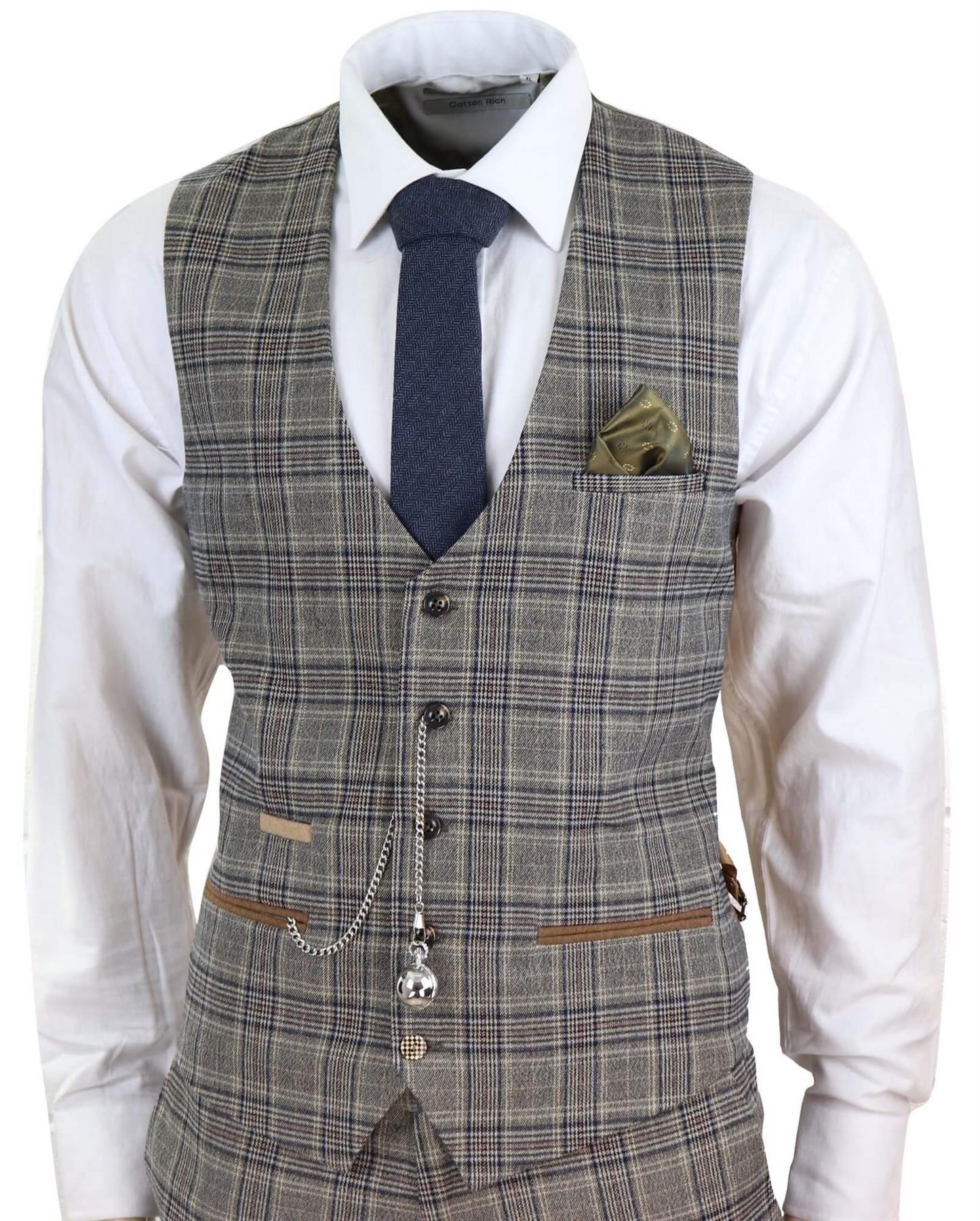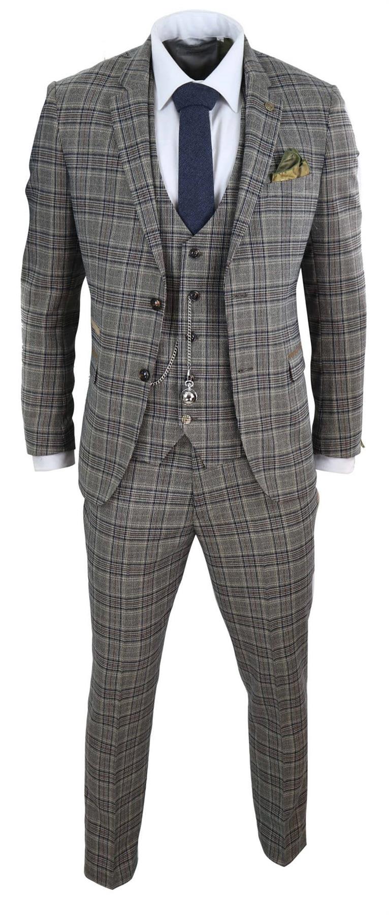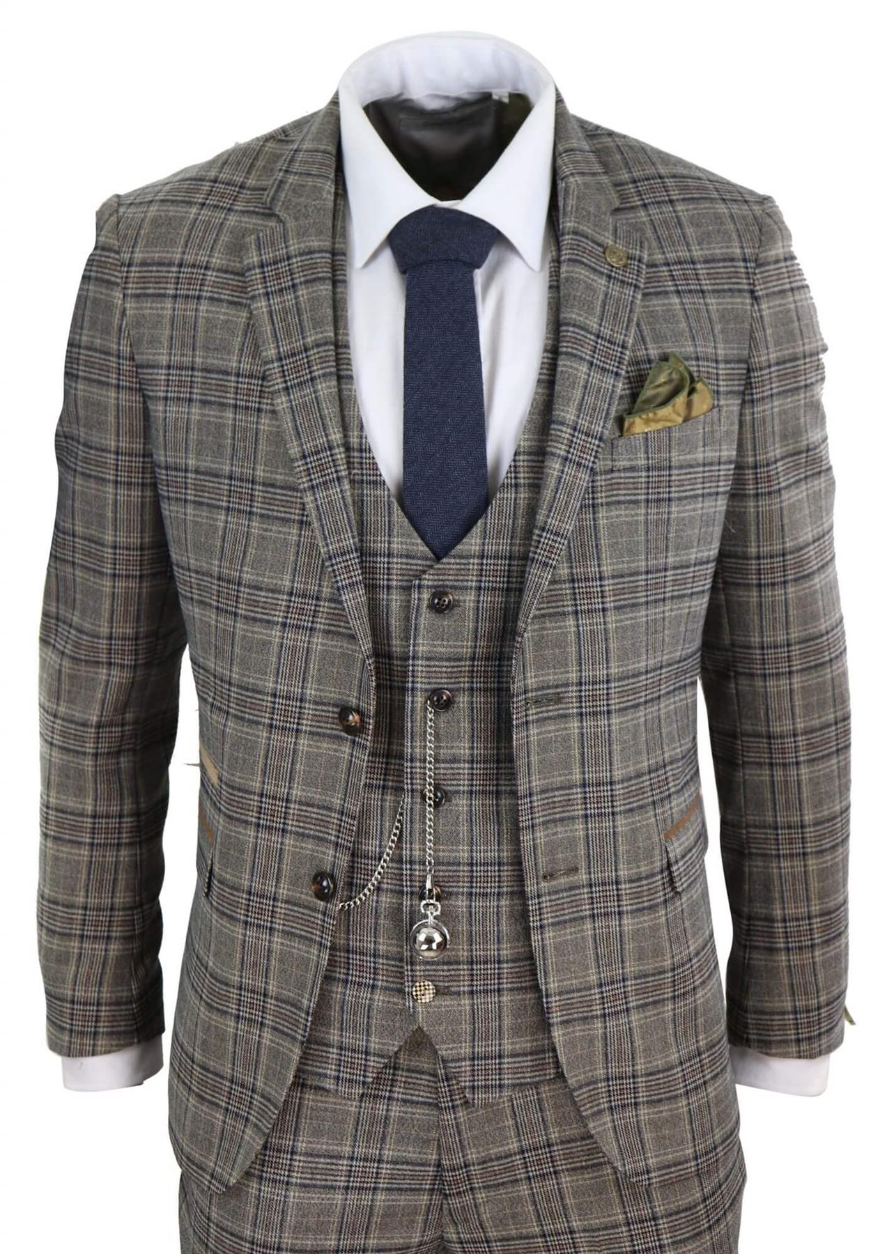 Mens 3 Piece Tan Brown Herringbone Check Suit