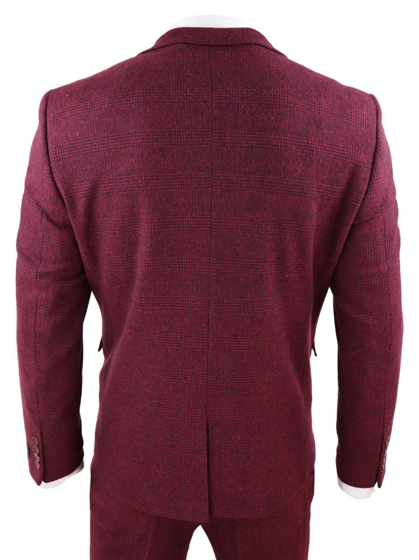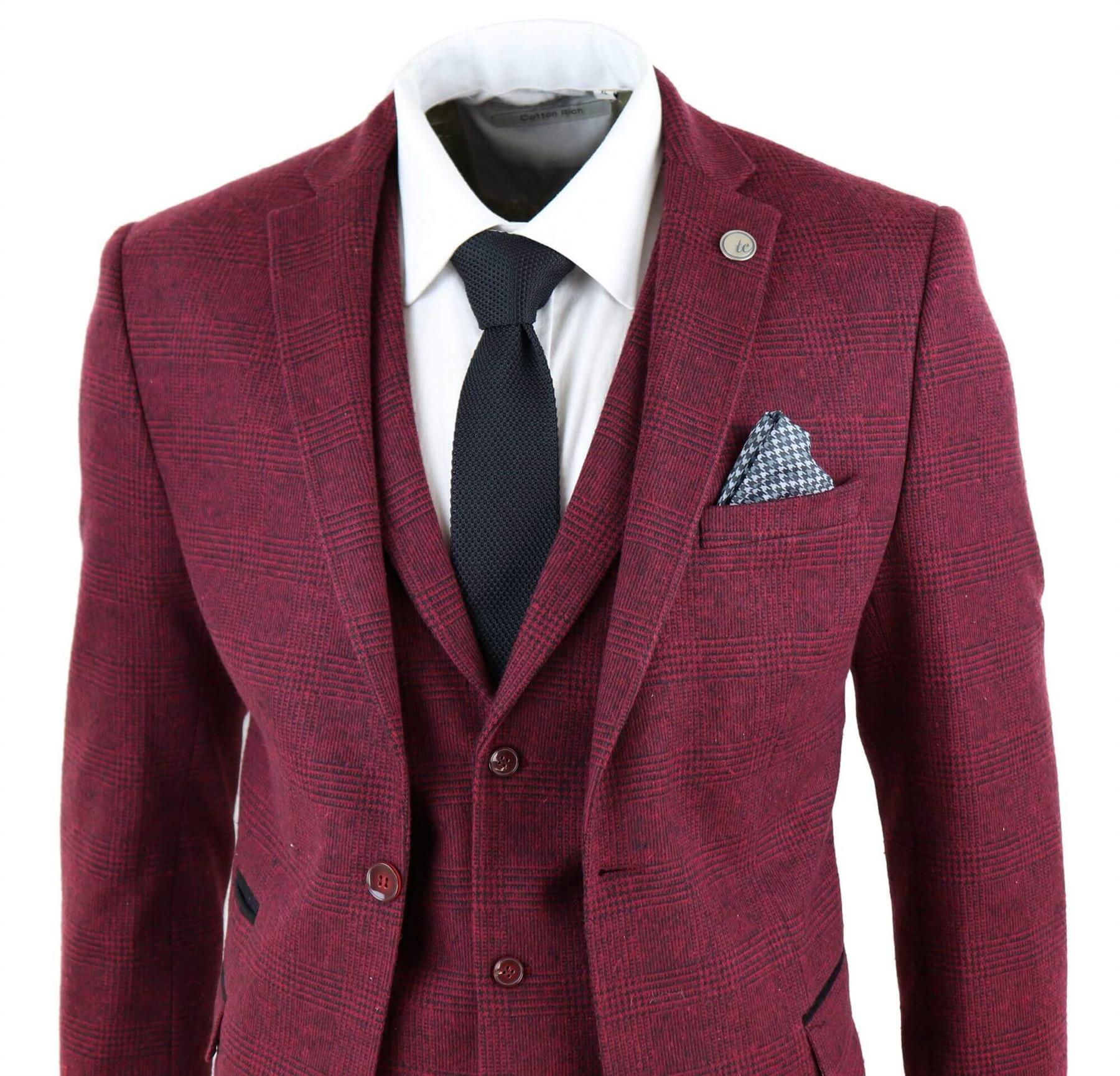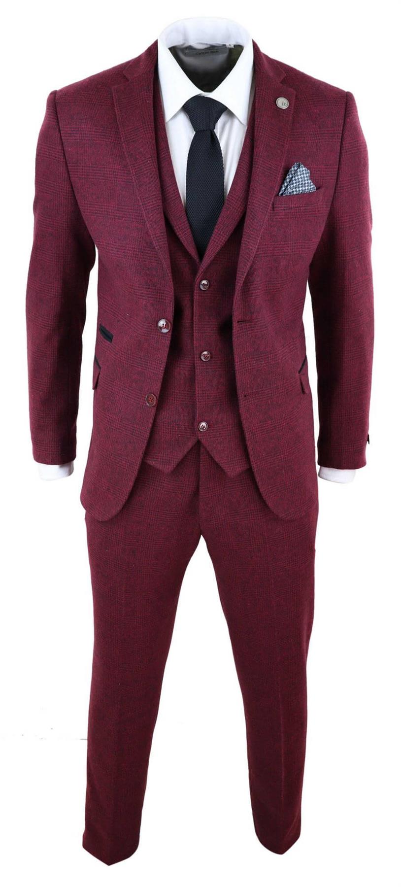Sharp, sleek and sophisticated, look the part with this premium 3 piece Burgundy Herringbone tweed suit, that features a Tailored Fit (inbetween Slim & Regular) with a closer fit across the chest and narrower tailored trousers. Crafted from 50% wool, the two-button jacket hangs beautifully and has a half canvas construction that moulds to your body shape the more you wear it. Contrasting Black flap pockets, buttoned cuffs and a single back vent lend the suit a classic touch of refinement.