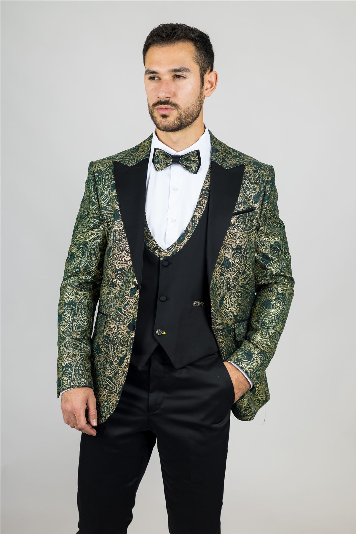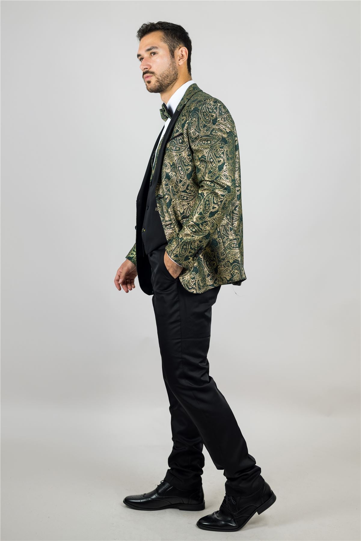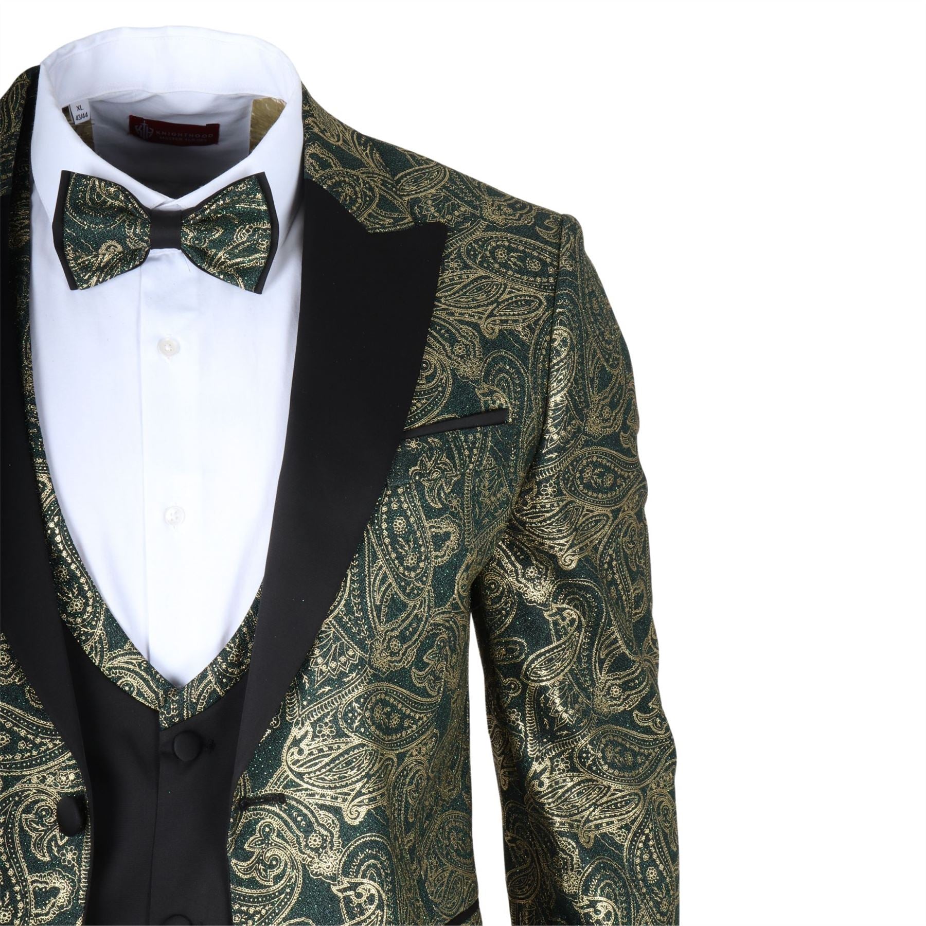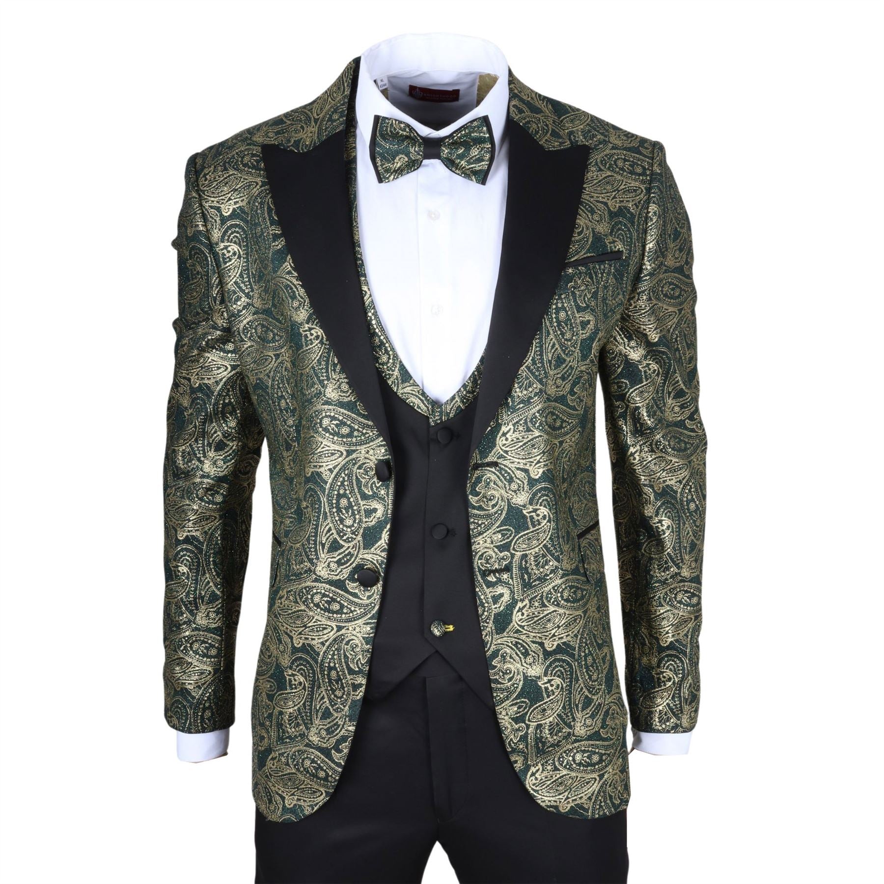 Stand out with this eye-catching three-piece tuxedo suit, designed to deliver elegance with a bold twist. The tailored-fit green blazer is adorned with rich gold paisley detailing, offering a luxurious finish perfect for weddings, parties, and formal events. A black waistcoat with gold paisley accents adds balance and flair, while the matching black trousers complete the sleek silhouette. Finished with a complimentary bowtie that mirrors the gold paisley theme, this suit brings together style, coordination, and confidence. Crafted from a comfortable polyester-lycra blend for a flattering and flexible fit.