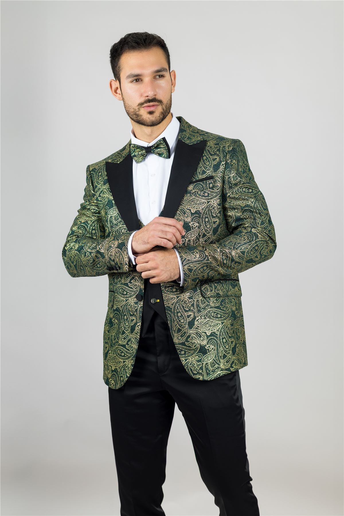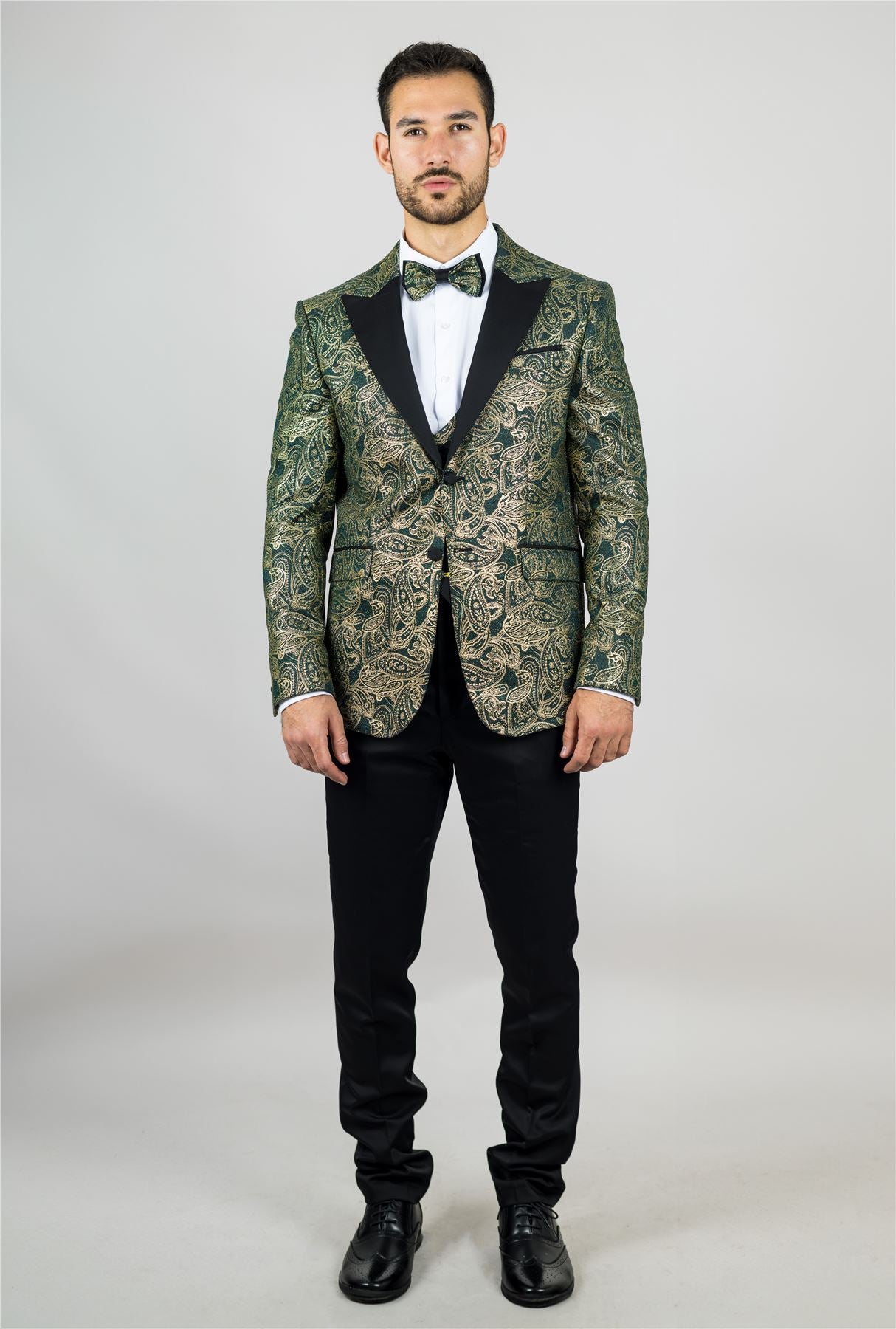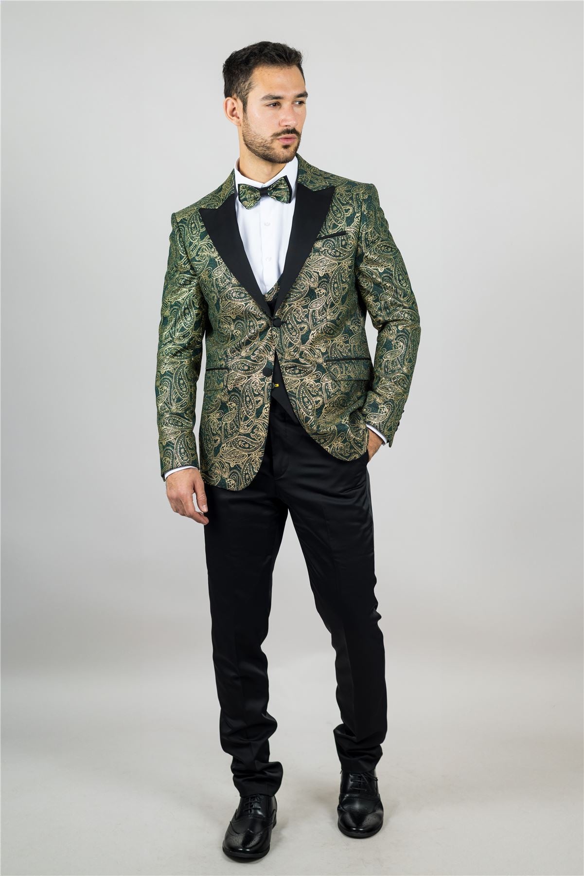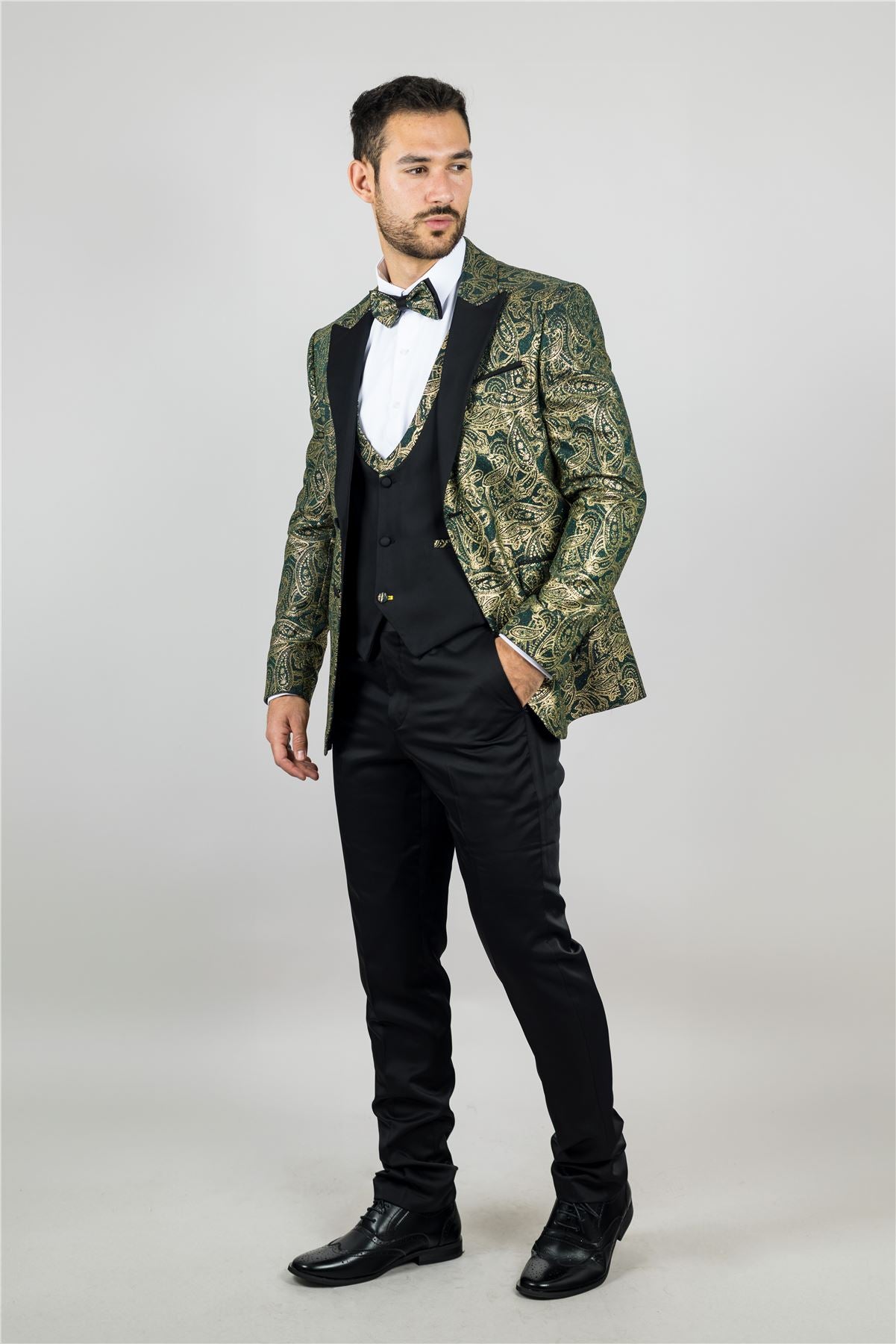 Stand out with this eye-catching three-piece tuxedo suit, designed to deliver elegance with a bold twist. The tailored-fit green blazer is adorned with rich gold paisley detailing, offering a luxurious finish perfect for weddings, parties, and formal events. A black waistcoat with gold paisley accents adds balance and flair, while the matching black trousers complete the sleek silhouette. Finished with a complimentary bowtie that mirrors the gold paisley theme, this suit brings together style, coordination, and confidence. Crafted from a comfortable polyester-lycra blend for a flattering and flexible fit.