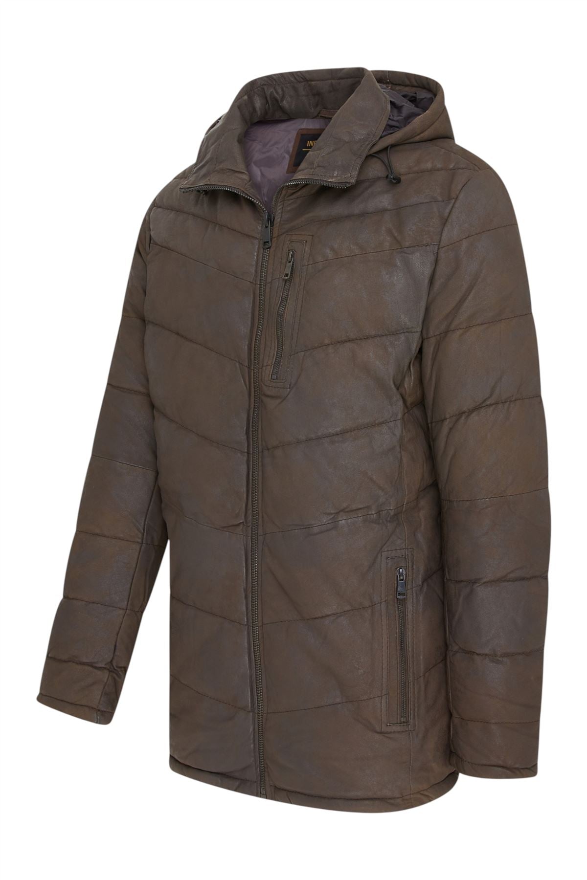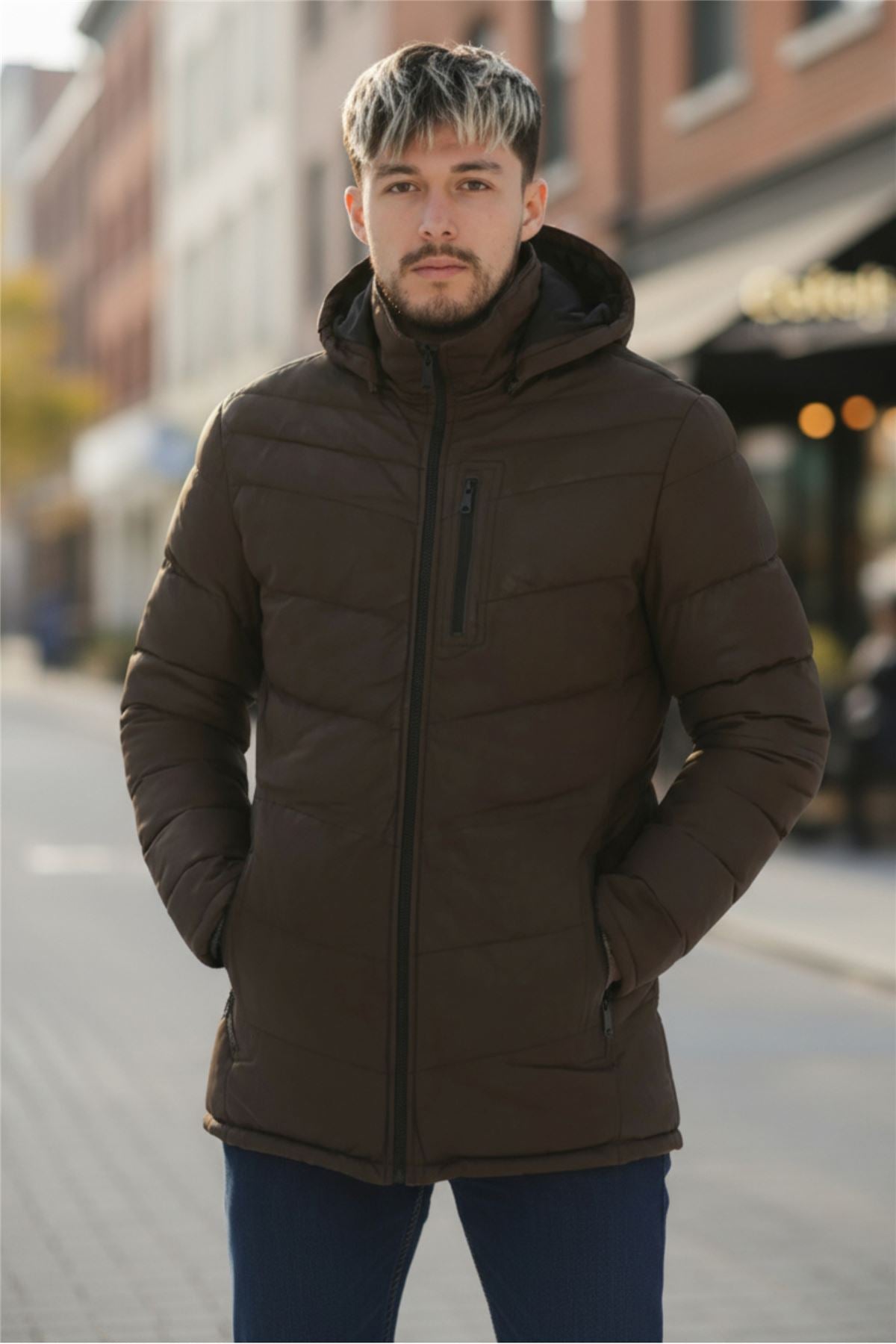 Men's Brown Leather Quilted Jacket Hooded Puffer Winter Coat - Olyic