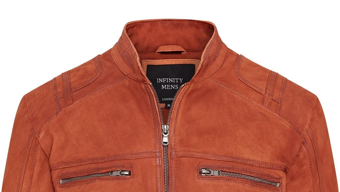 Introducing the Men’s Biker Leather Jacket, a striking piece with a matte finish. Crafted from sheep aniline leather, this jacket boasts a vintage, nubuck look. The exposed YKK zip front leads to a short nehru collar, complemented by four zipped pockets and gauntlet-style cuffs. Extra panels on the collar and shoulder, along with ribbed stitch quilting on the side panels, add a unique touch. Inside, the fully lined poplin interior features two additional leather-trimmed pockets, one zipped and one buttoned for security.