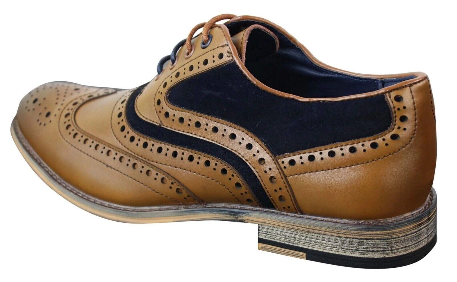 Mens Classic Navy Suede Oxford Brogue Shoes in Tan Leather