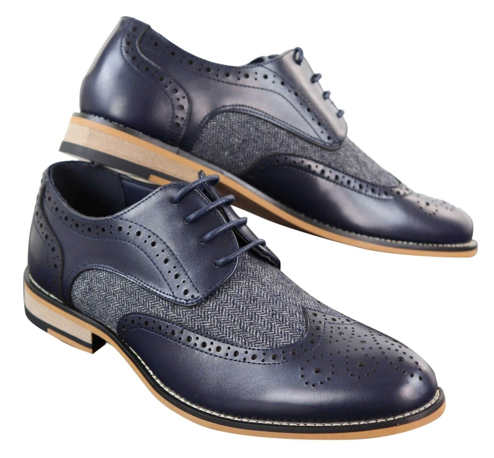 Mens Classic Oxford Tweed Brogue Shoes In Navy Leather
