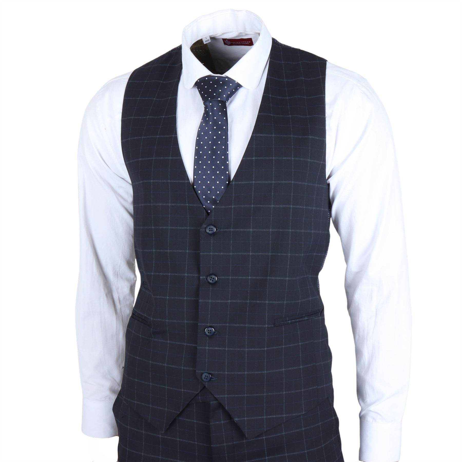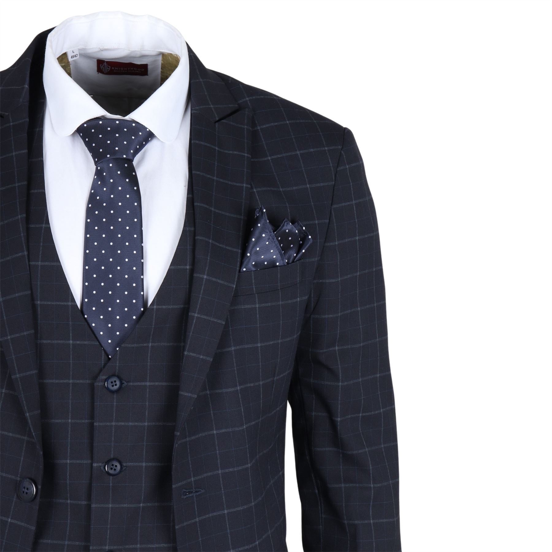Men's Navy Checked 3 Piece Suit Tailored Fit