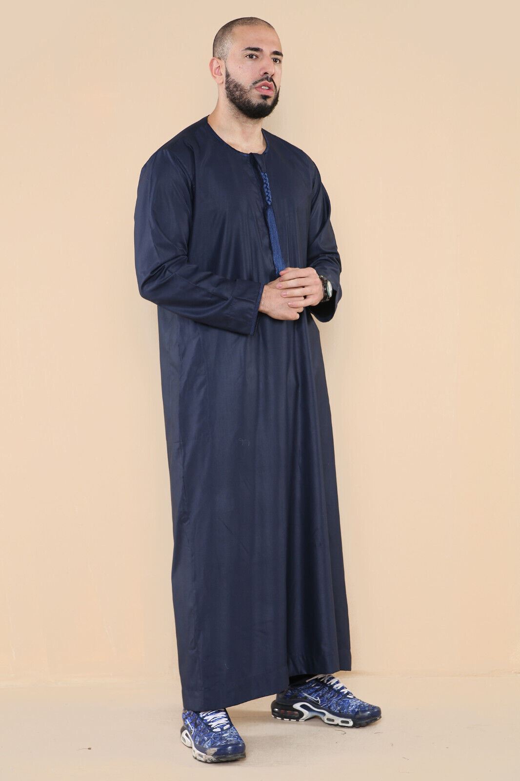 Mens Navy Thobe Jubba Saudi Islamic Arab Eid Emirati Kaftan Jubbah Tassel Robe