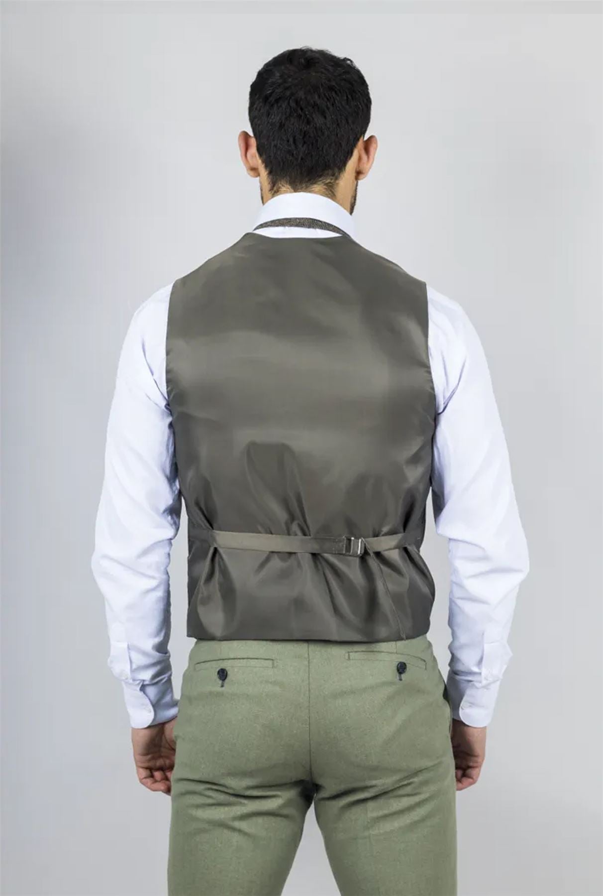 Waistcoat: Fitted through the waist with an adjustable buckle, 2 jetted pockets, 1 chest pocket, and a notch lapel.