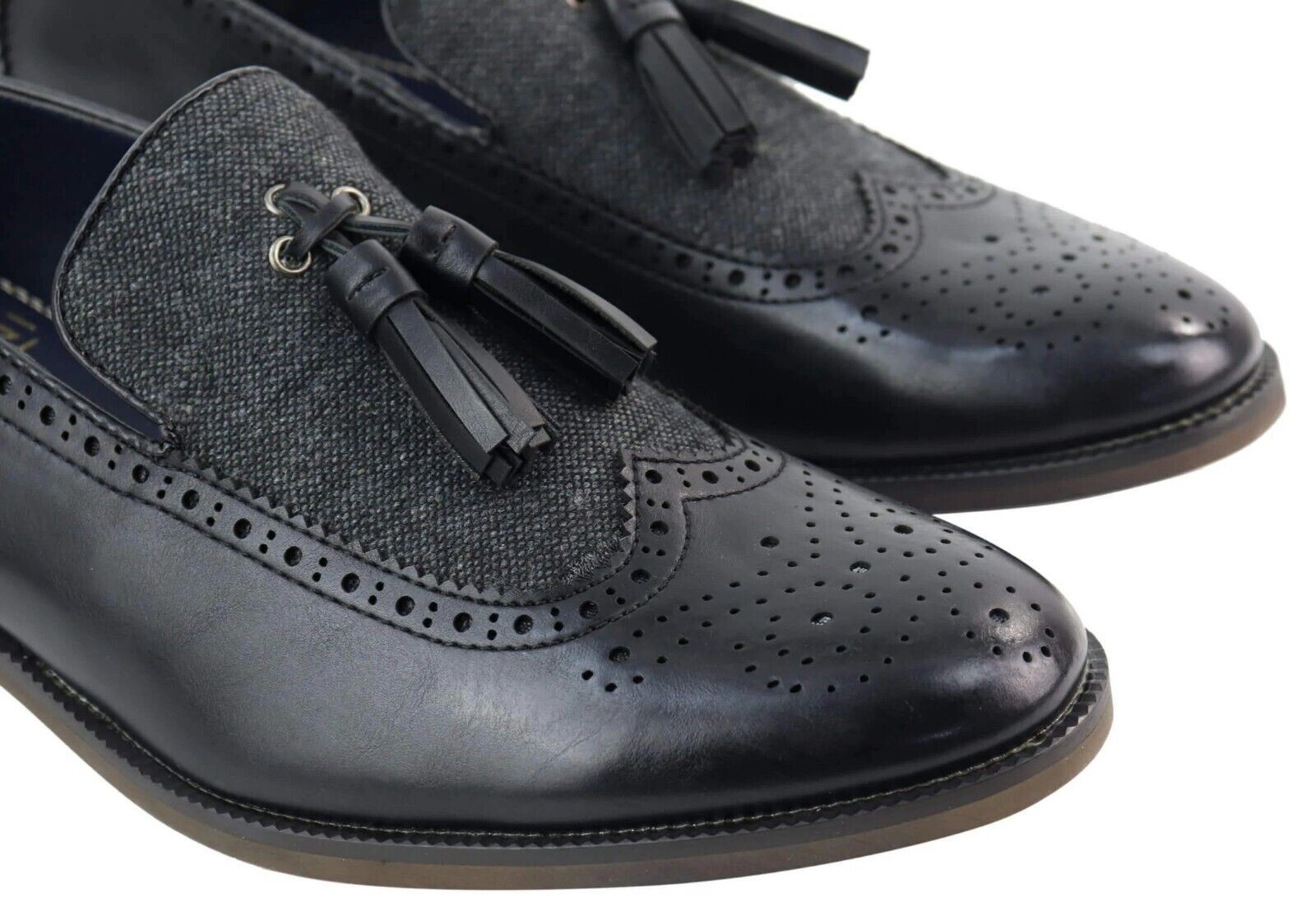 Mens Tasselled Black Leather Tweed Brogue Slip On Loafers