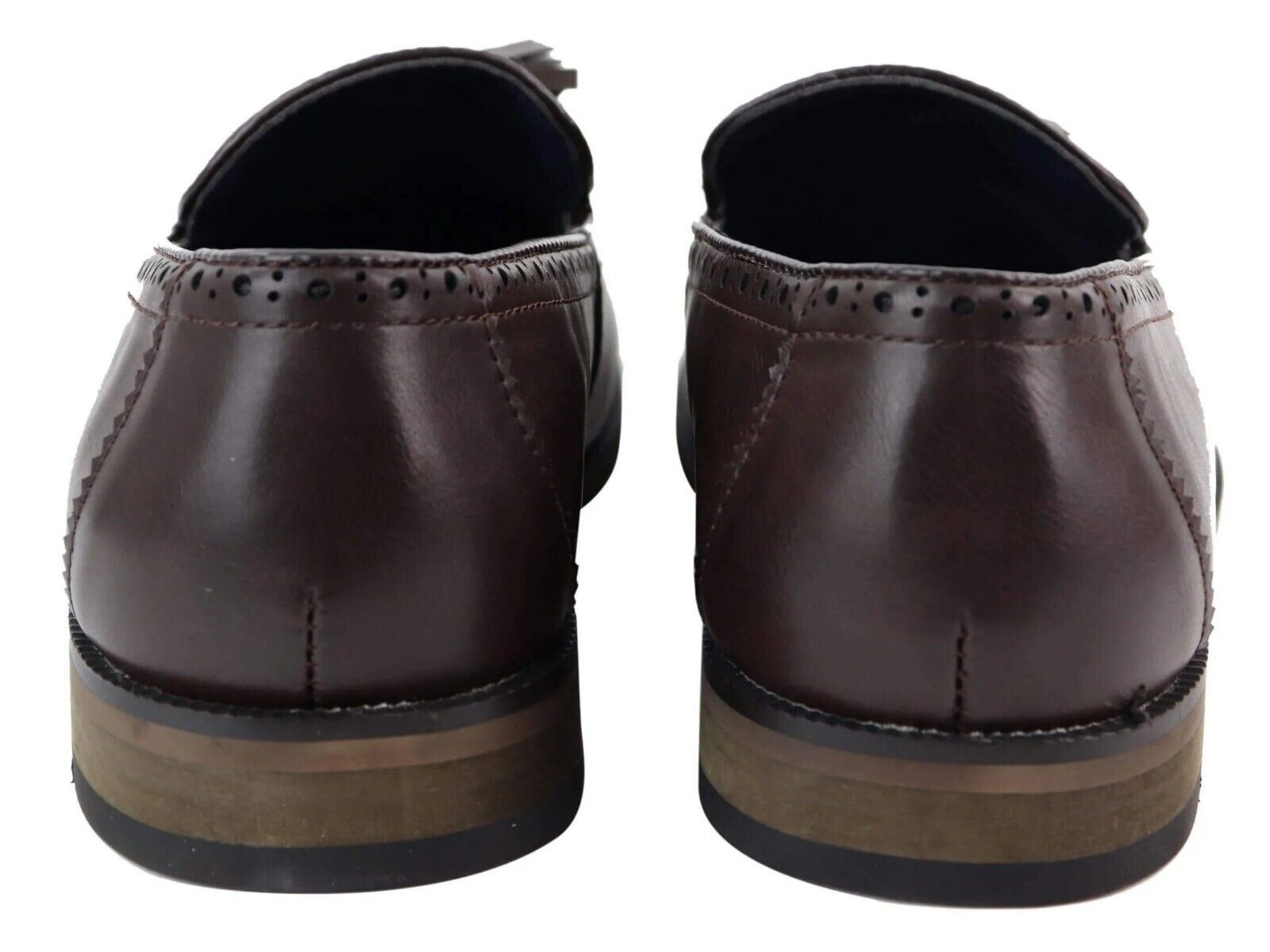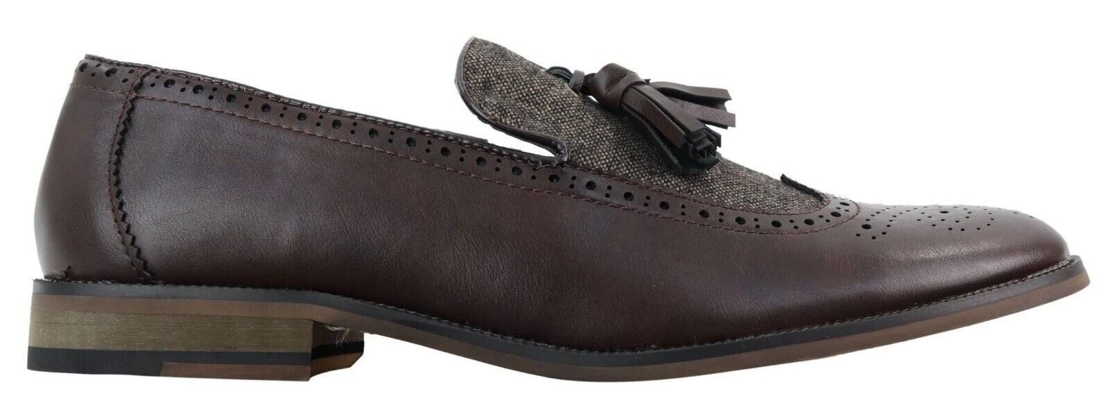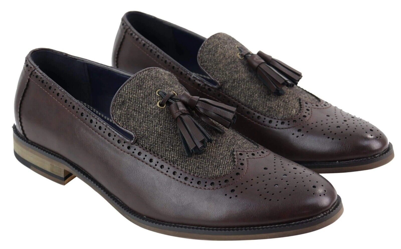 Mens Tasselled Brown Leather Tweed Brogue Slip On Loafers