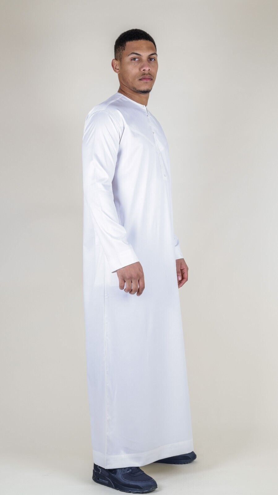 Men's White Thobe Robe Satin Emirati Islamic Jubba Eid Slim Fit