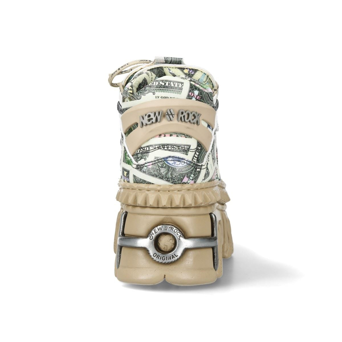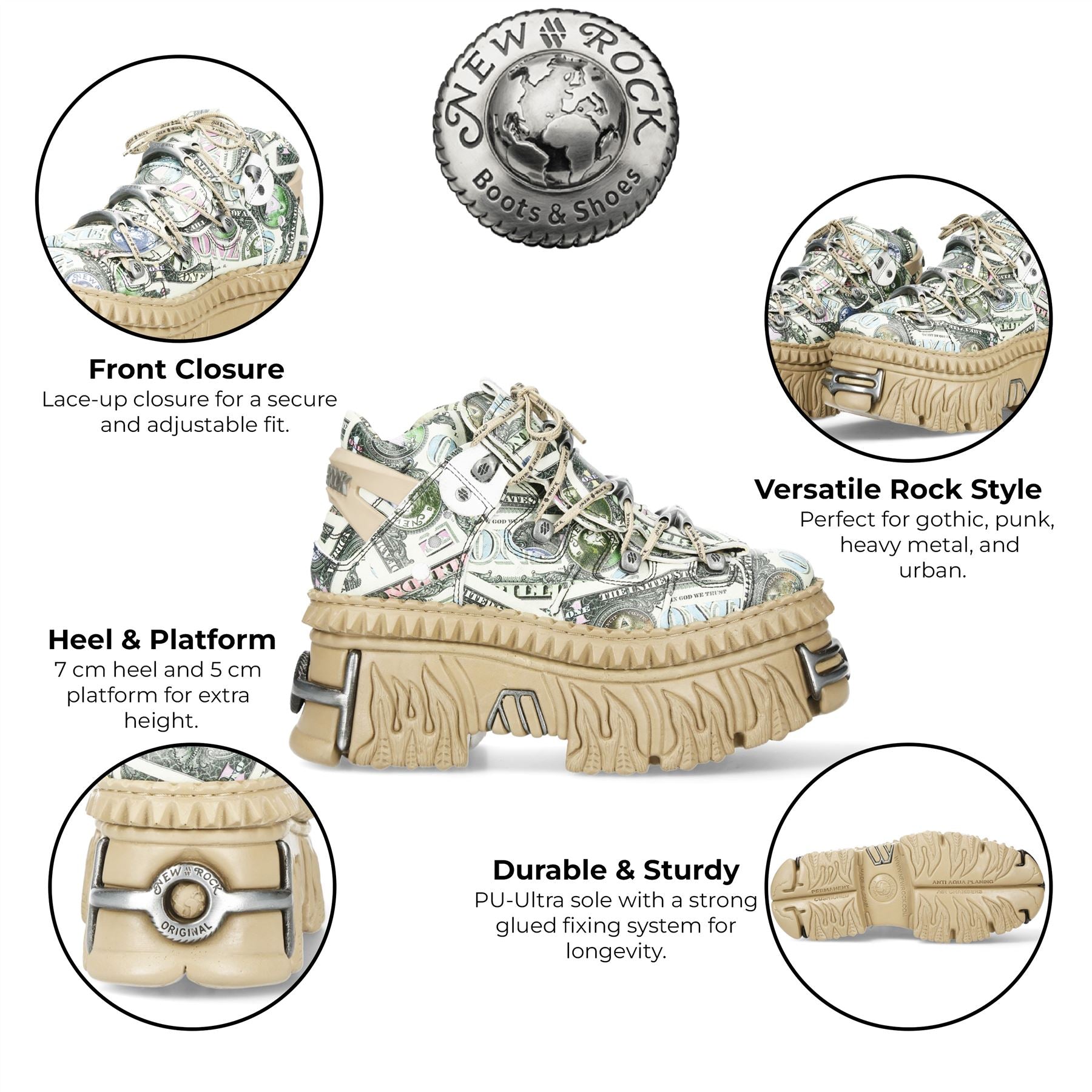 Featuring an eye-catching dollar bill print on genuine cow leather, these boots blend urban streetwear with New Rock’s signature punk and rock aesthetic. The PU-ULTRA sole offers durability and support, while the 6.5 cm heel and 5 cm platform provide an elevated look. With a calfskin lining, cord lace-up closure, and a glued sole fixation, these custom boots redefine swag with their unique money-inspired design.