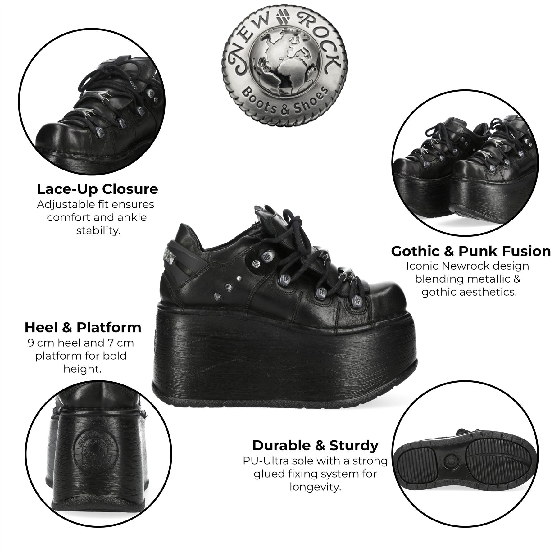 The New Rock M-120N-C96 ankle boots from the Metallic Collection deliver an electrifying blend of gothic, punk, and rock influences. Made from high-quality black cow leather with a calf-skin interior, these boots offer durability and comfort. The bold 9 cm platform heel and 7 cm platform sole create a powerful, elevated look, perfect for making a statement. Featuring a lace-up closure for a secure fit, these unisex boots embody the extreme, rebellious energy of New Rock footwear.
