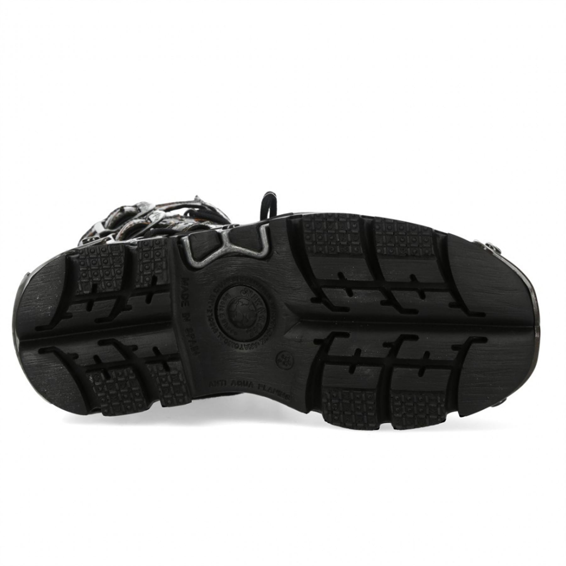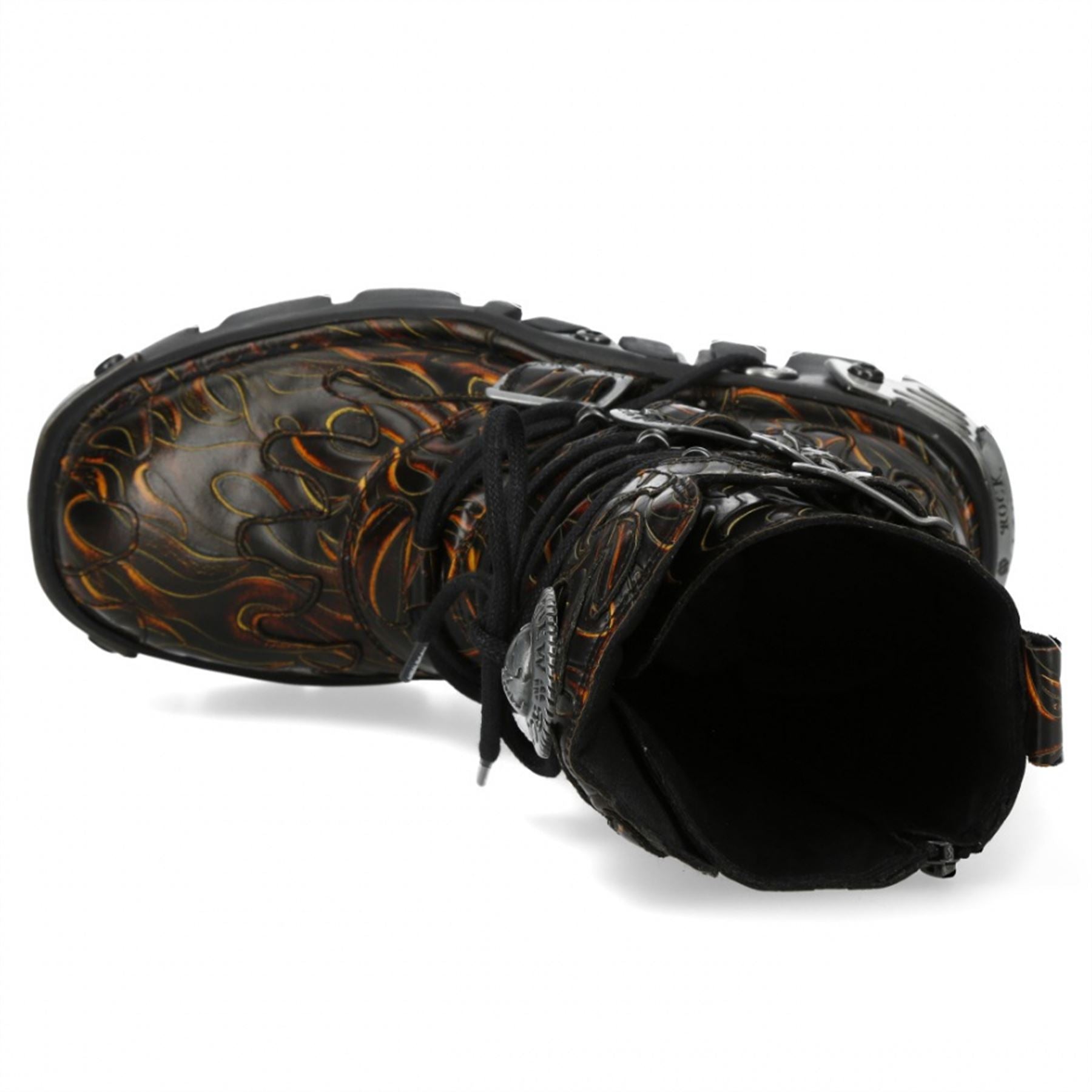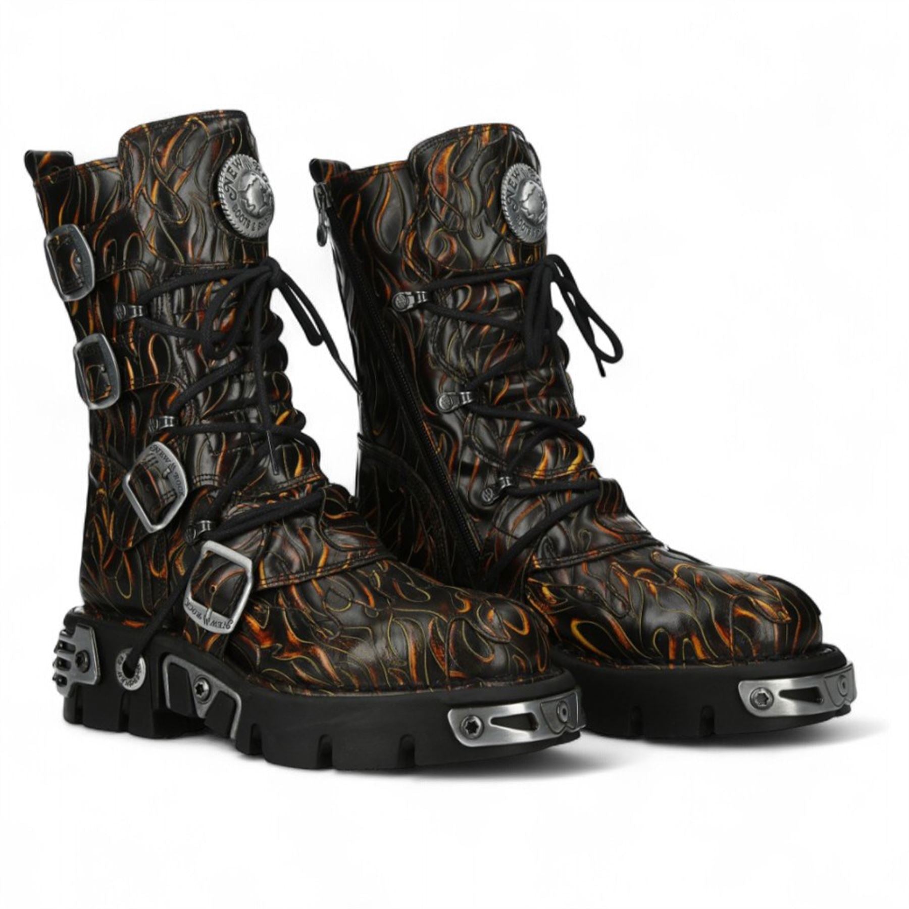 Striking and fierce, the New Rock M-591-C62 boots from the Metallic Collection merge gothic and punk elements with fiery flair. Crafted from black cowhide leather with bold flame detailing and a synthetic interior, these boots deliver standout style with rugged construction. The flat sole, 6 cm heel, and 3 cm platform provide comfort and lift, while the lace-up, zipper, and buckle fastenings ensure a secure fit. Designed for those who live loud and unapologetic, this unisex boot is a true symbol of alternative fashion.