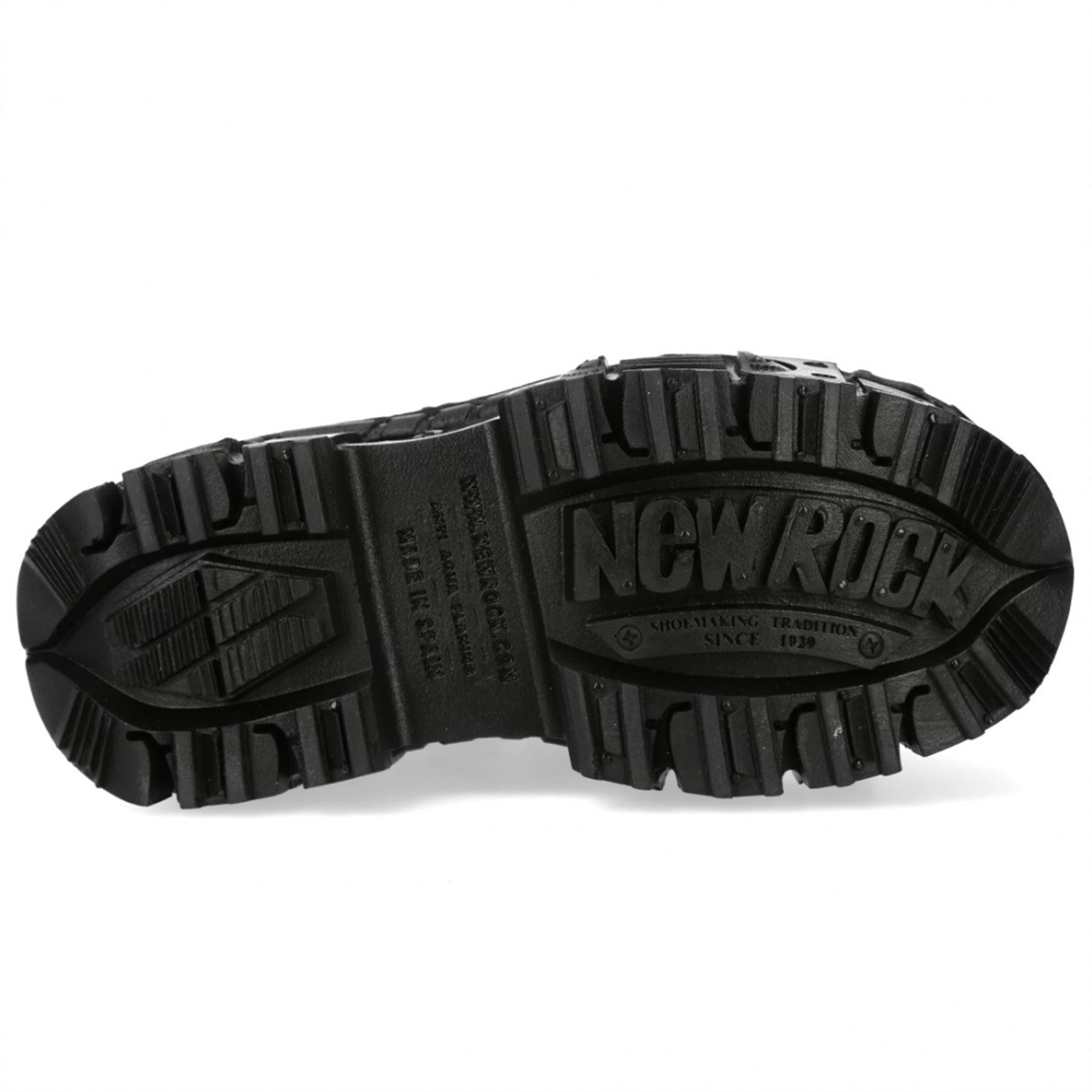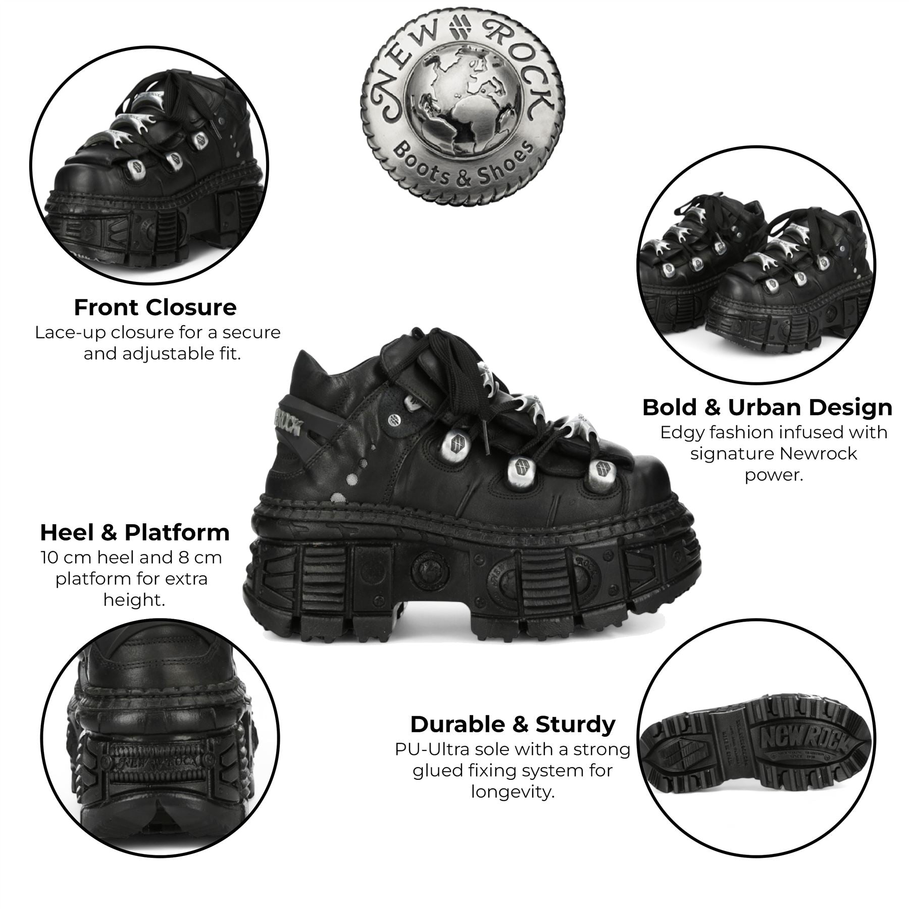 Elevate your street style with the New Rock M-OVERZ106B-C1 boots from the Wall Collection. Crafted from genuine black cowhide leather with a premium calfskin interior, these custom-made ankle boots fuse heavy rock attitude with urban design. Featuring a bold flat sole with a 10 cm heel and 8 cm platform, they offer dramatic lift and standout presence. The lace-up closure and durable PU Ultra sole—glued and sewn for extra strength—make these boots a powerful expression of alternative fashion.