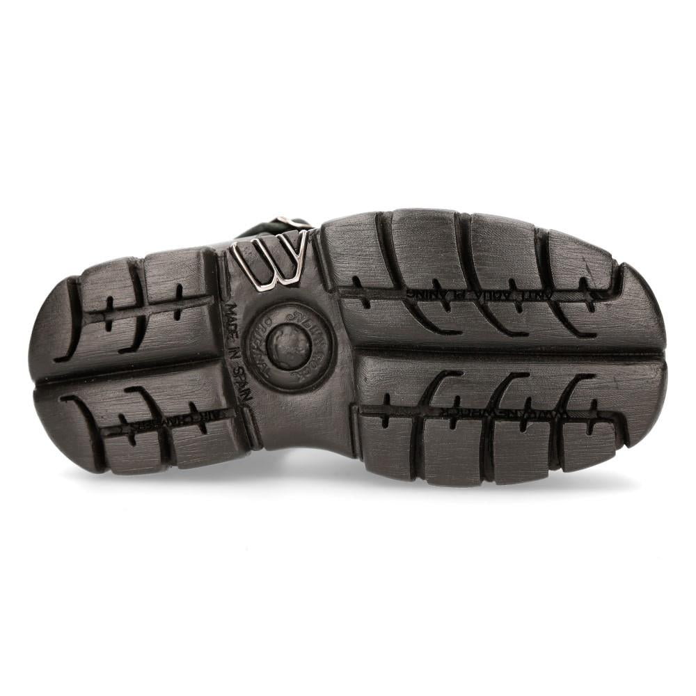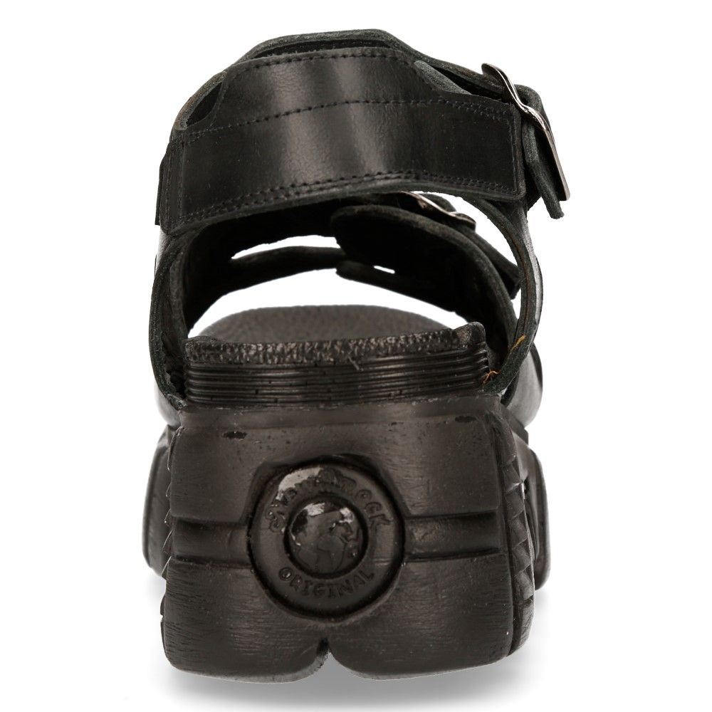 Metallic Accents: The traditional sandal strap closure is adorned with metal buckles, complementing the metallic New Rock logo and sole inserts, which accentuate the premium black leather upper and maintain the stylish Gothic aesthetic.