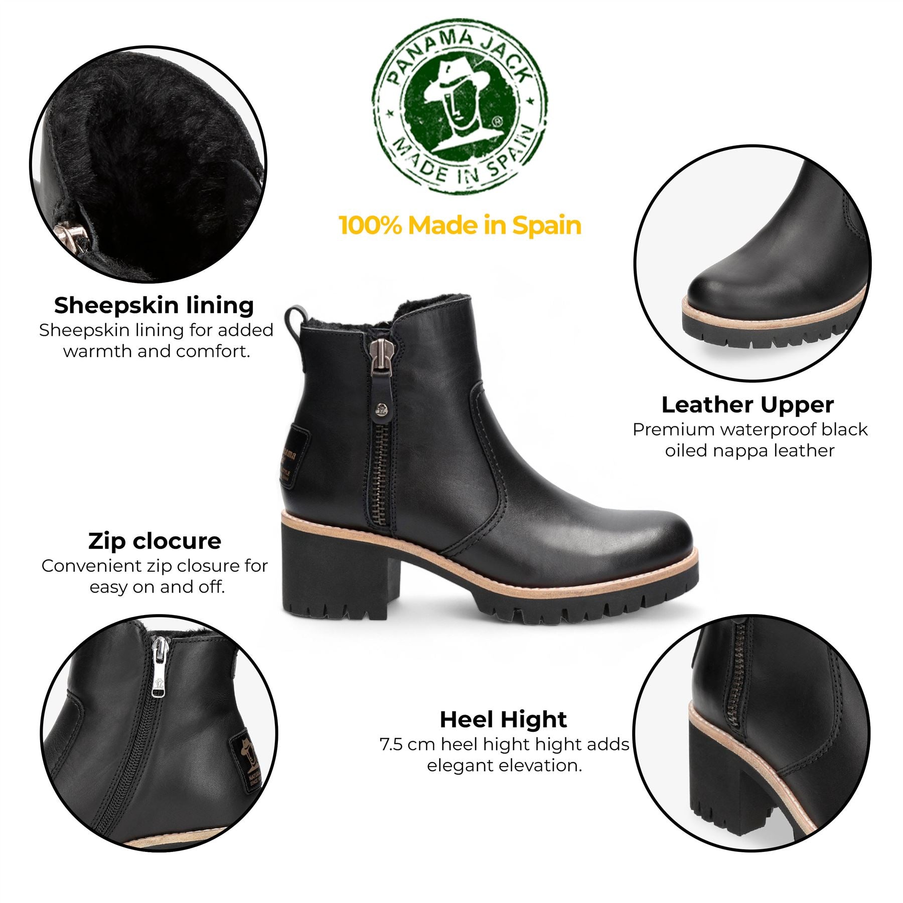 Step into style and comfort with the Pauline Trav B2 black ankle boots from Panama Jack. These sleek, waterproof black Napa leather boots offer both elegance and durability. Designed with a warm lining, they keep your feet cozy, while the anatomical insole ensures lasting comfort. The flexible and durable TPU rubber sole provides excellent grip and support. With a stylish heel height of 7.5 cm and a shaft height of 12.5 cm, these boots are perfect for both everyday wear and outdoor adventures.