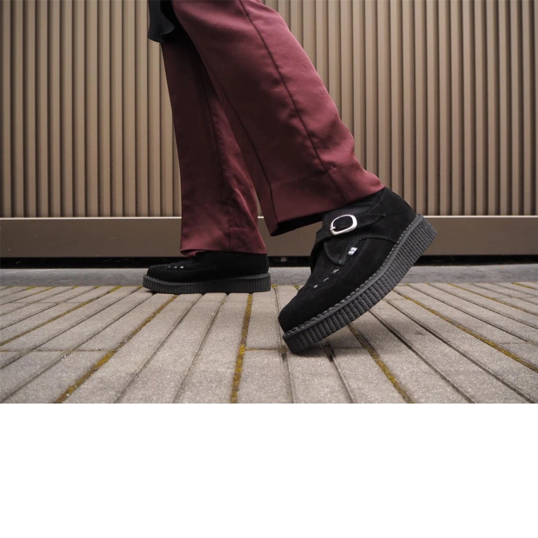 The T.U.K. Pointed Creeper in black suede delivers a sleek take on a timeless alternative classic. Featuring a sharp pointed toe, matching black interlace, and a monk strap with silver buckle, this style sits on a lightweight ribbed rubber sole. Clean, understated, and effortlessly versatile for day or night wear.