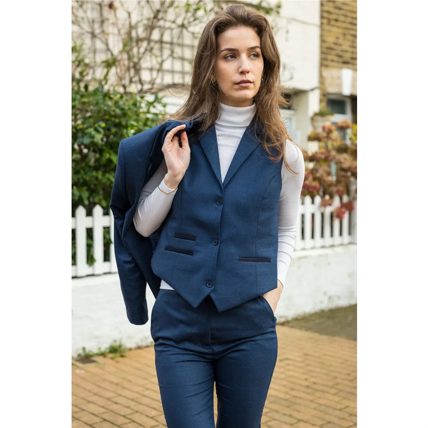 Command attention in the boardroom or at formal events with this elegant Women's 3-Piece Suit, styled in a sophisticated navy blue Prince of Wales check pattern. Designed with a flattering tailored fit, the suit enhances your silhouette while offering all-day comfort. Crafted from a premium blend of 65% polyester and 35% viscose, it delivers both durability and a luxurious feel—ideal for long hours in professional settings. The versatile set includes a structured blazer, a matching vest, and coordinating trousers, allowing you to wear the pieces together for a complete look or separately to suit various occasions.