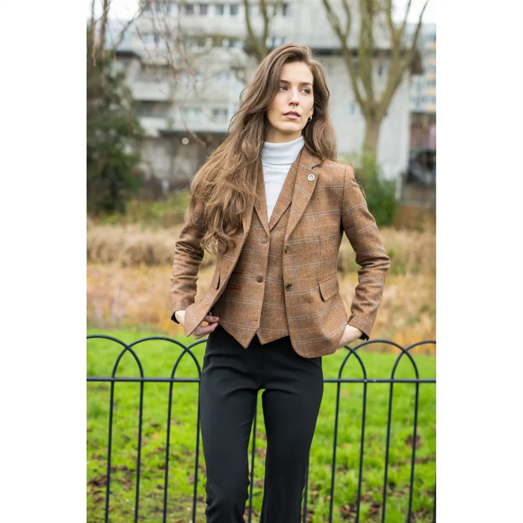 Women's Oak Brown Tailored Fit Tweed Waistcoat in Herringbone Check